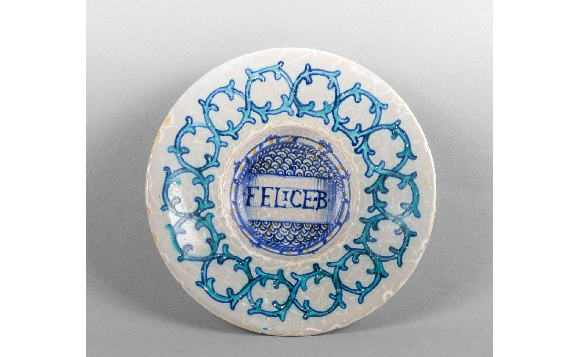 Piattino in maiolica policroma decorato con ghirlande che racchiude scritta 'Felice B' Deruta sec.XIX