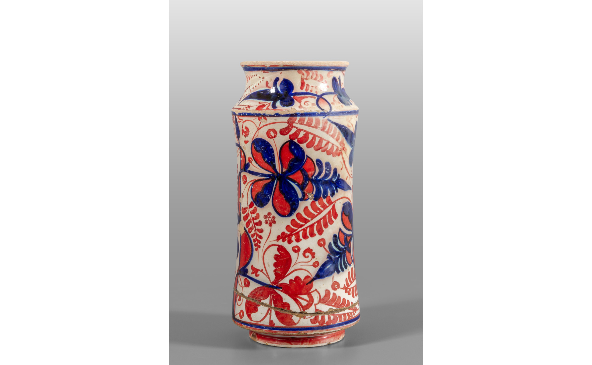 Albarello da farmacia in maiolica con decorazione a lustro con tralci di fiori e foglie Spagna sec.XIX