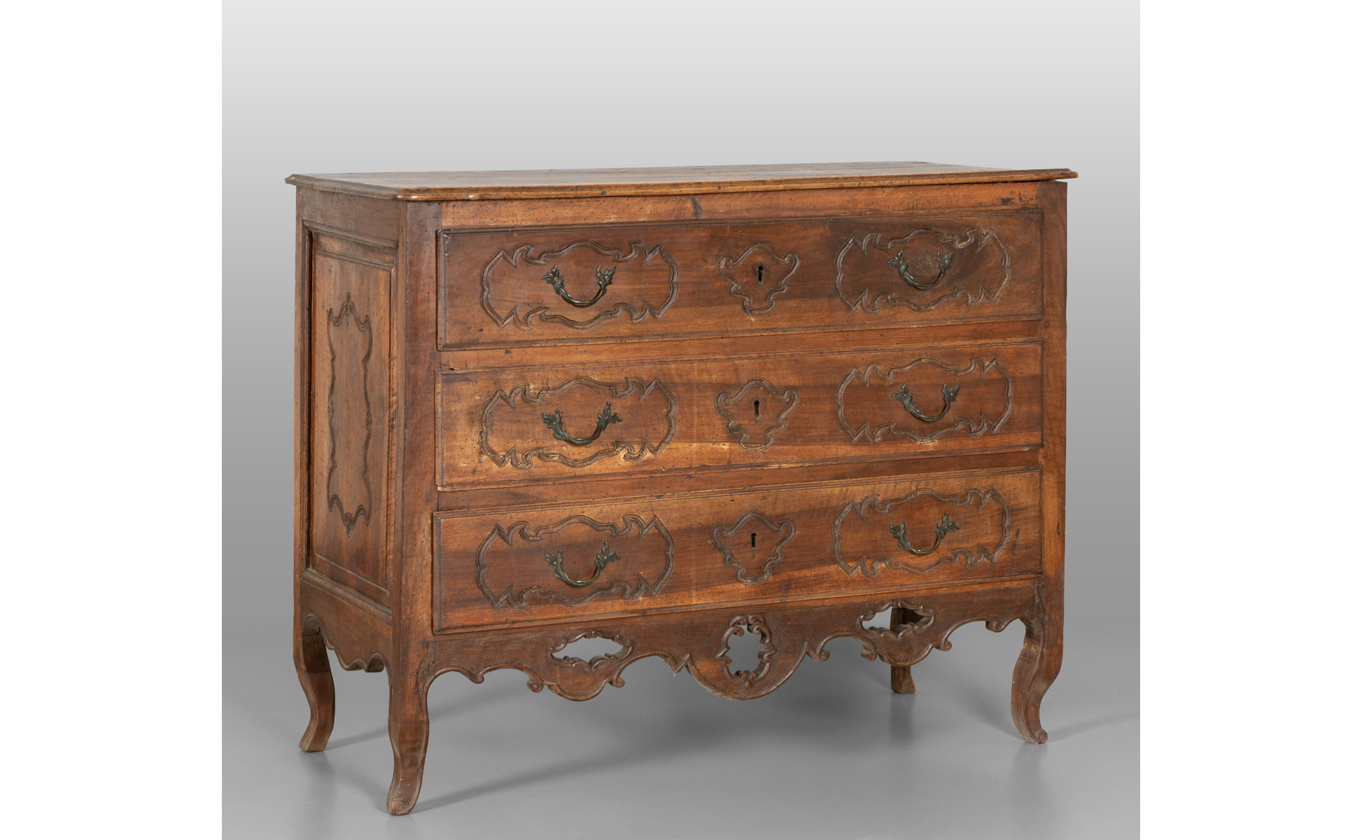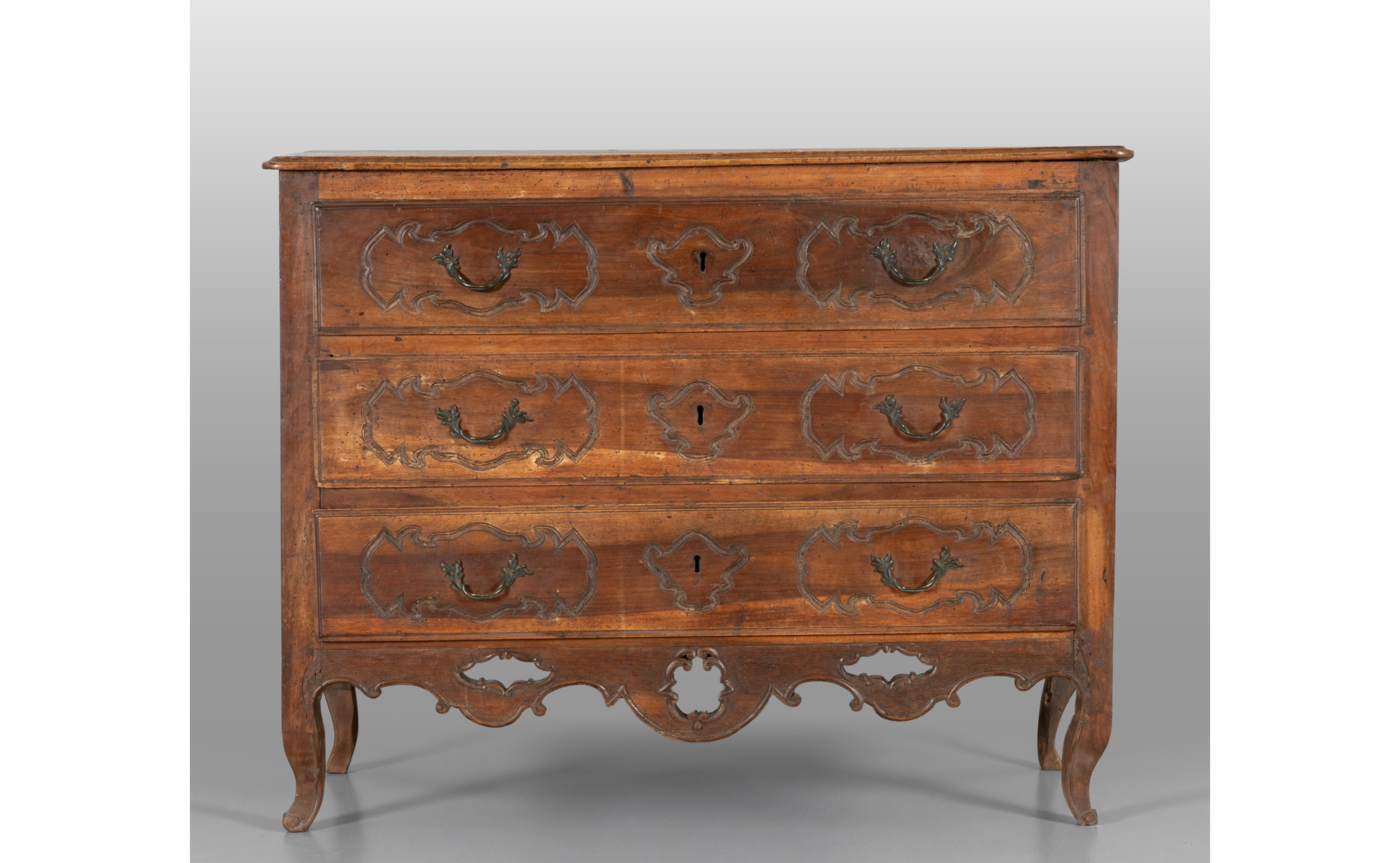 Comò Luigi XIV in noce tre cassetti sul fronte finemente scolpiti Italia Centrale I metà sec.XVIII