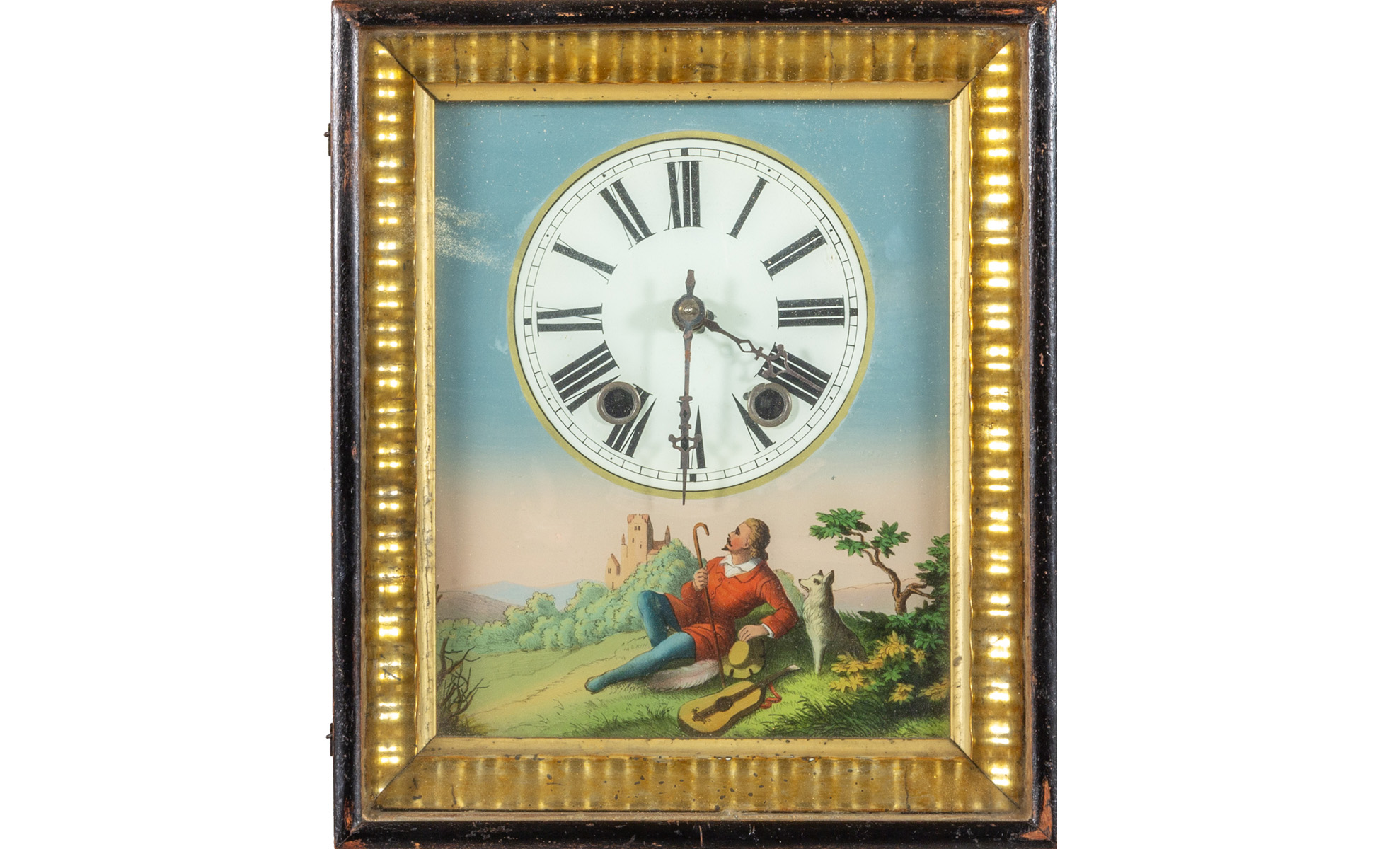 Orologio da parete quadrante in vetro dipinto in policromia sec. XIX