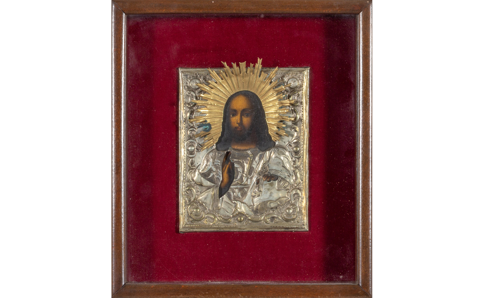 Cristo icona su tavola con riza in metallo argentato Russia sec.XIX