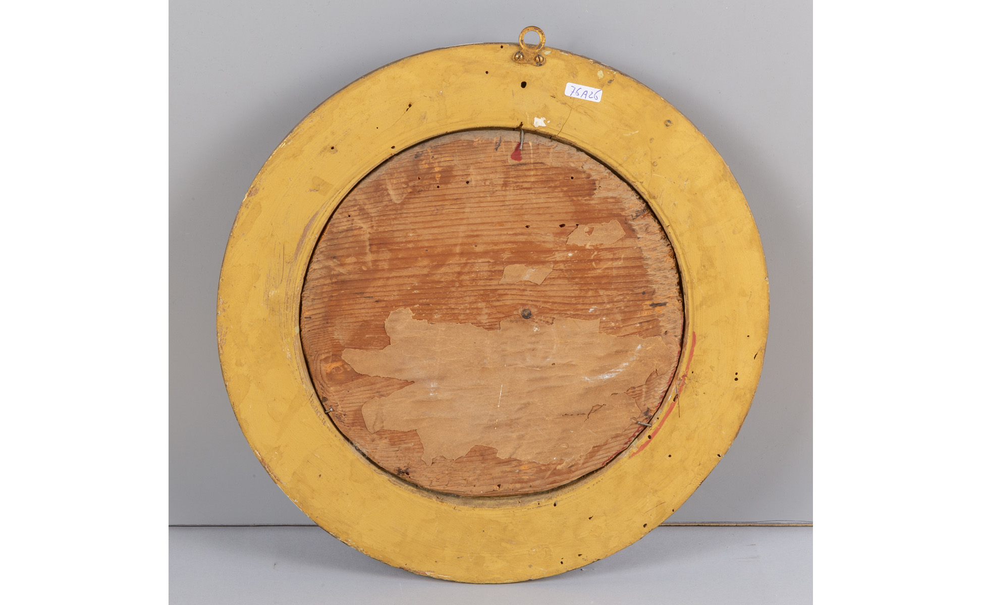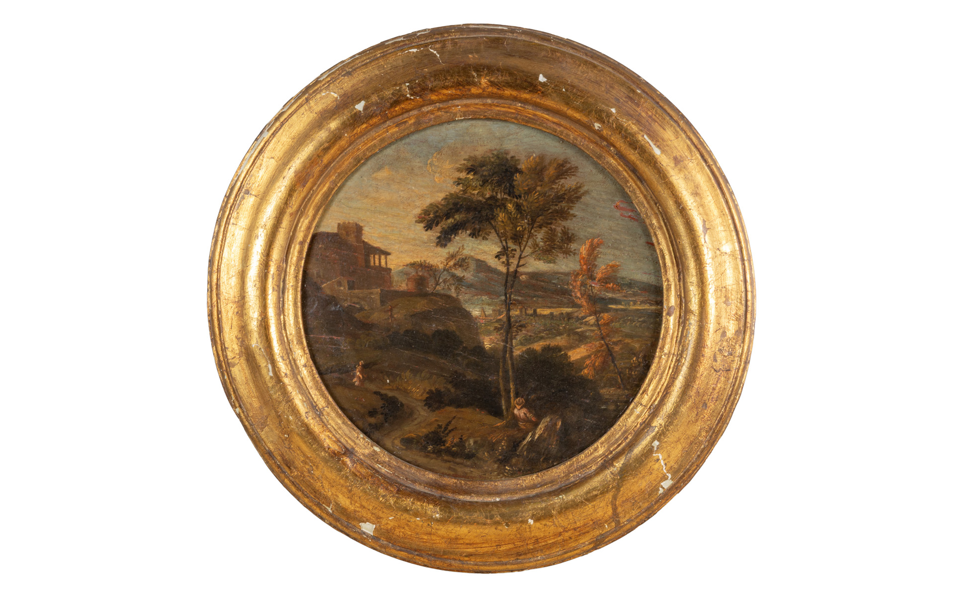 'Paesaggio con personaggi e casolare' olio su tavola di forma rotonda sec.XVIII