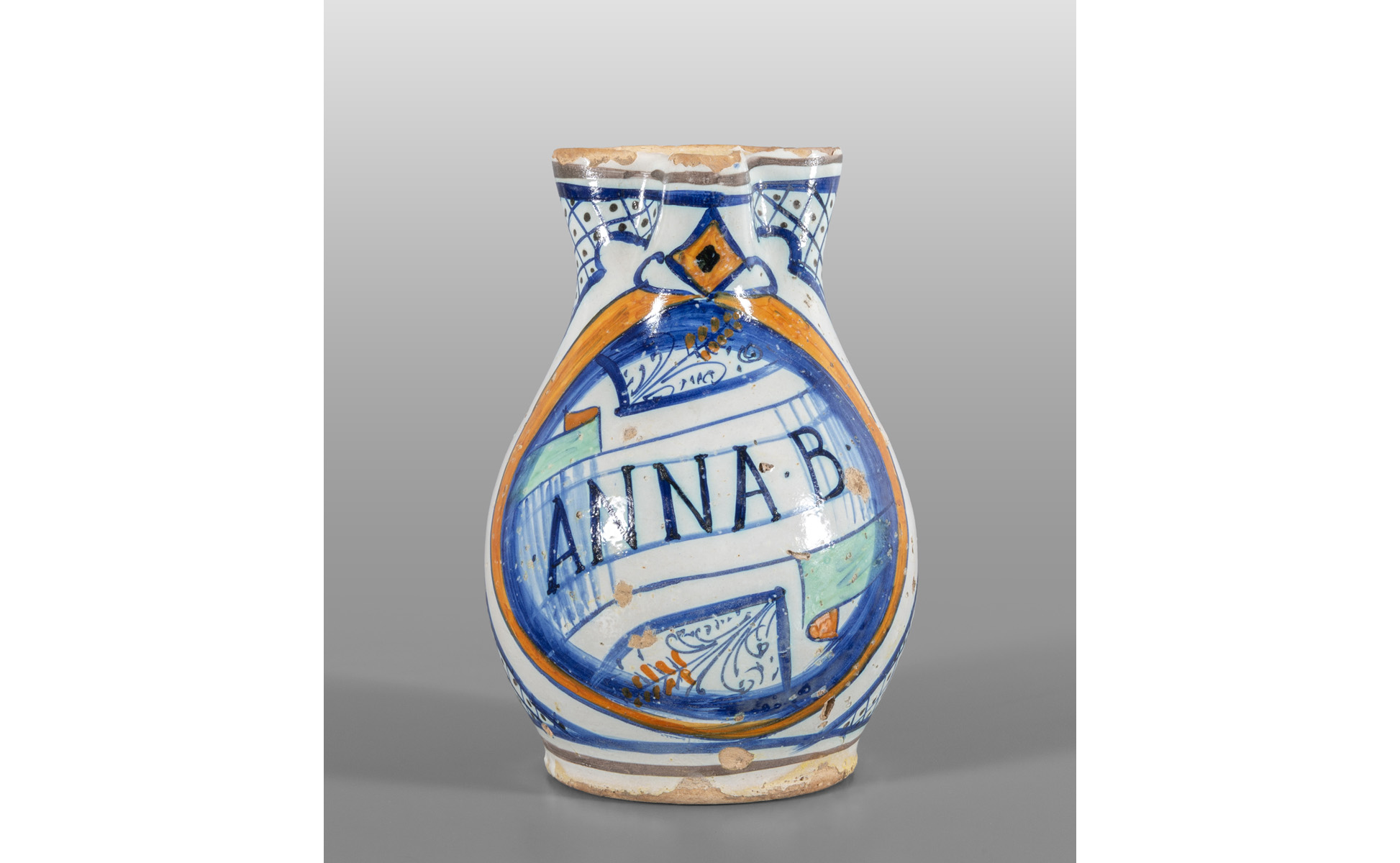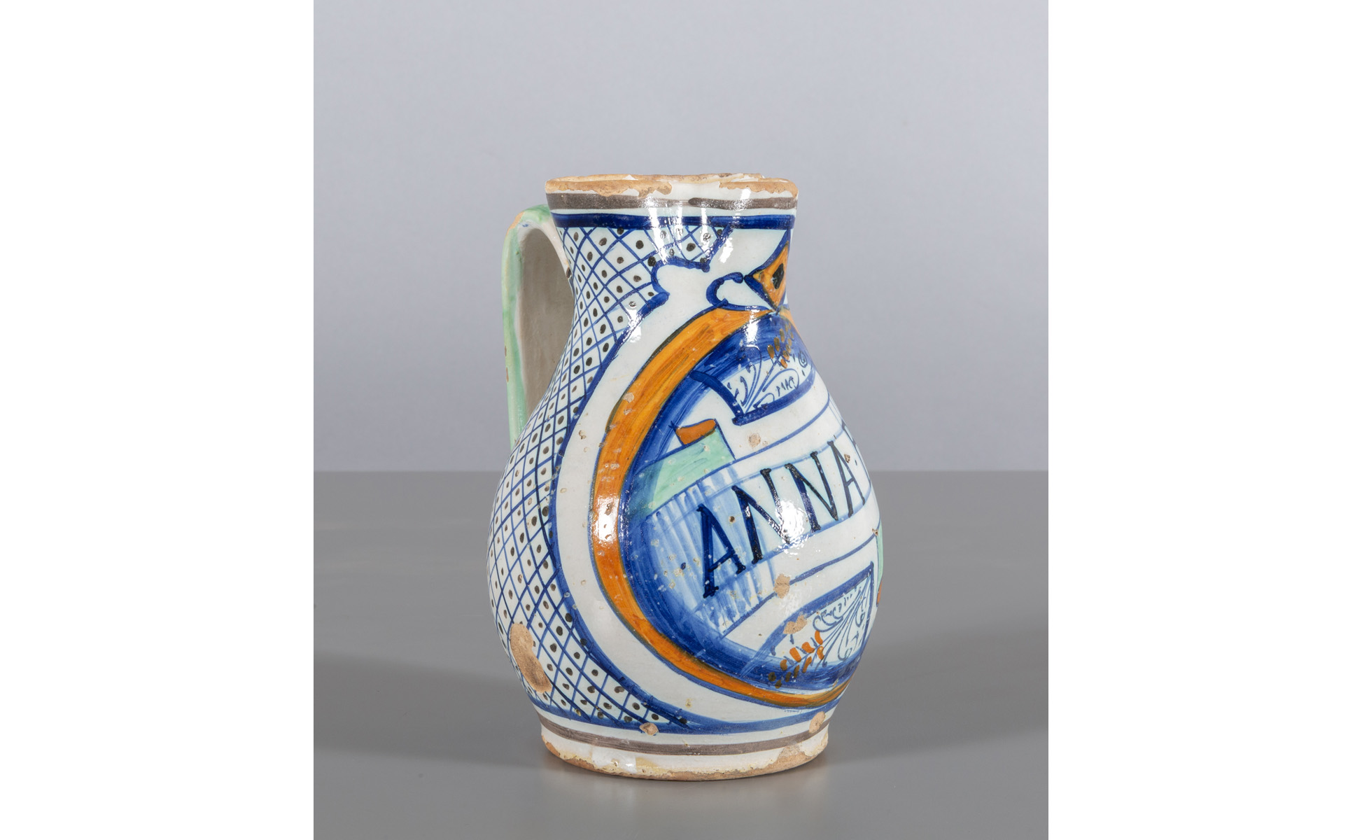 Boccale in maiolica policroma con al centro scritta 'Anna' e decoro floreale ai lati Faenza sec.XIX