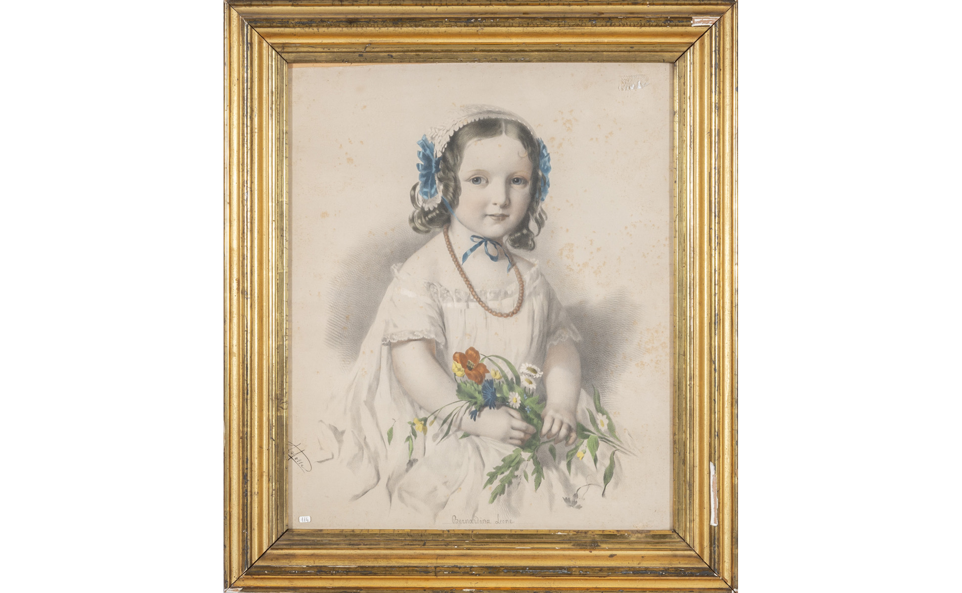 Bambina con mazzo di fiori stampa cornice in legno intagliato e dorato