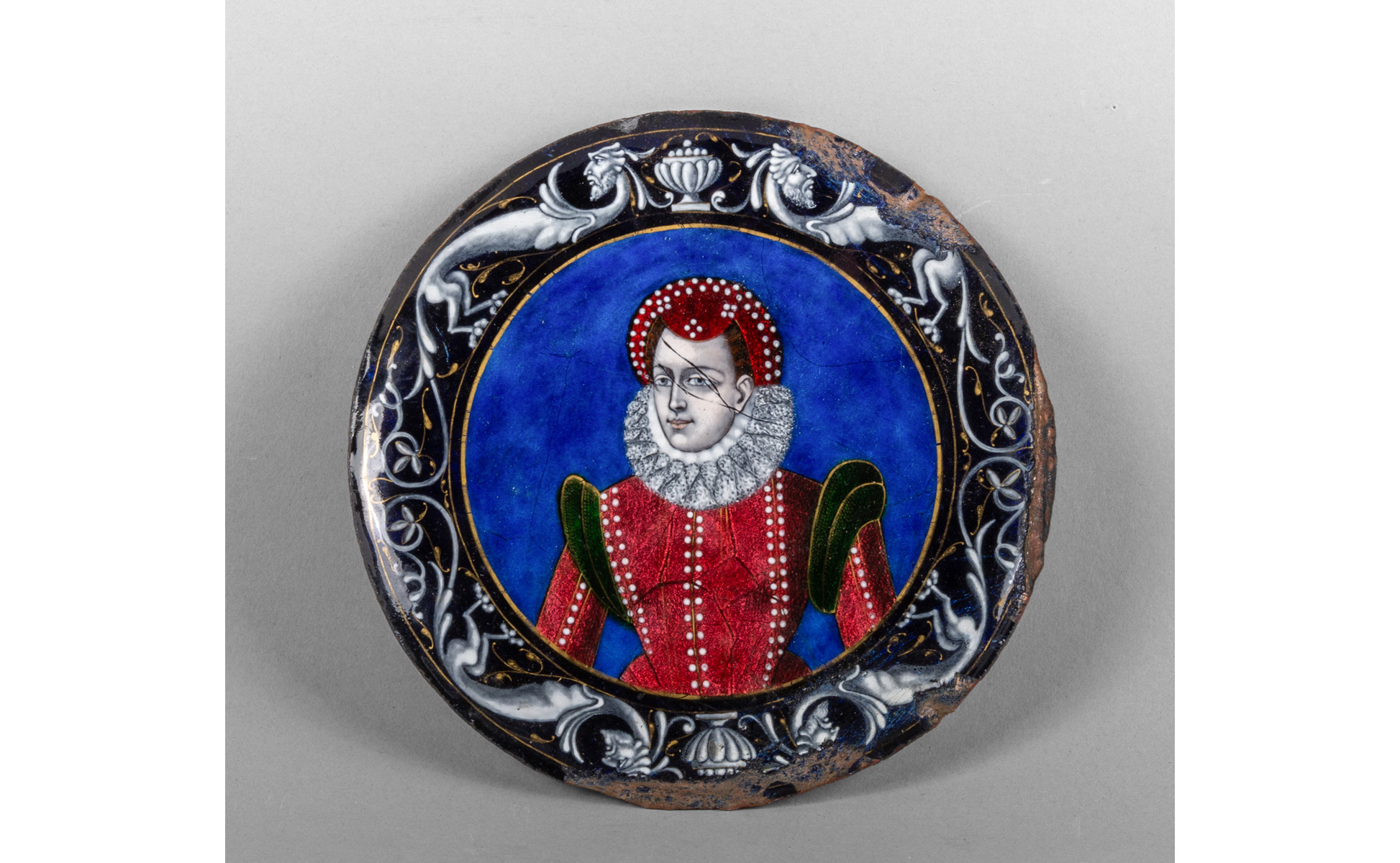 Piatto decorato in smalto raffigurante gentiluomo in abito rosso bordo a grottesche decorate a grisaille Limoges sec.XIX