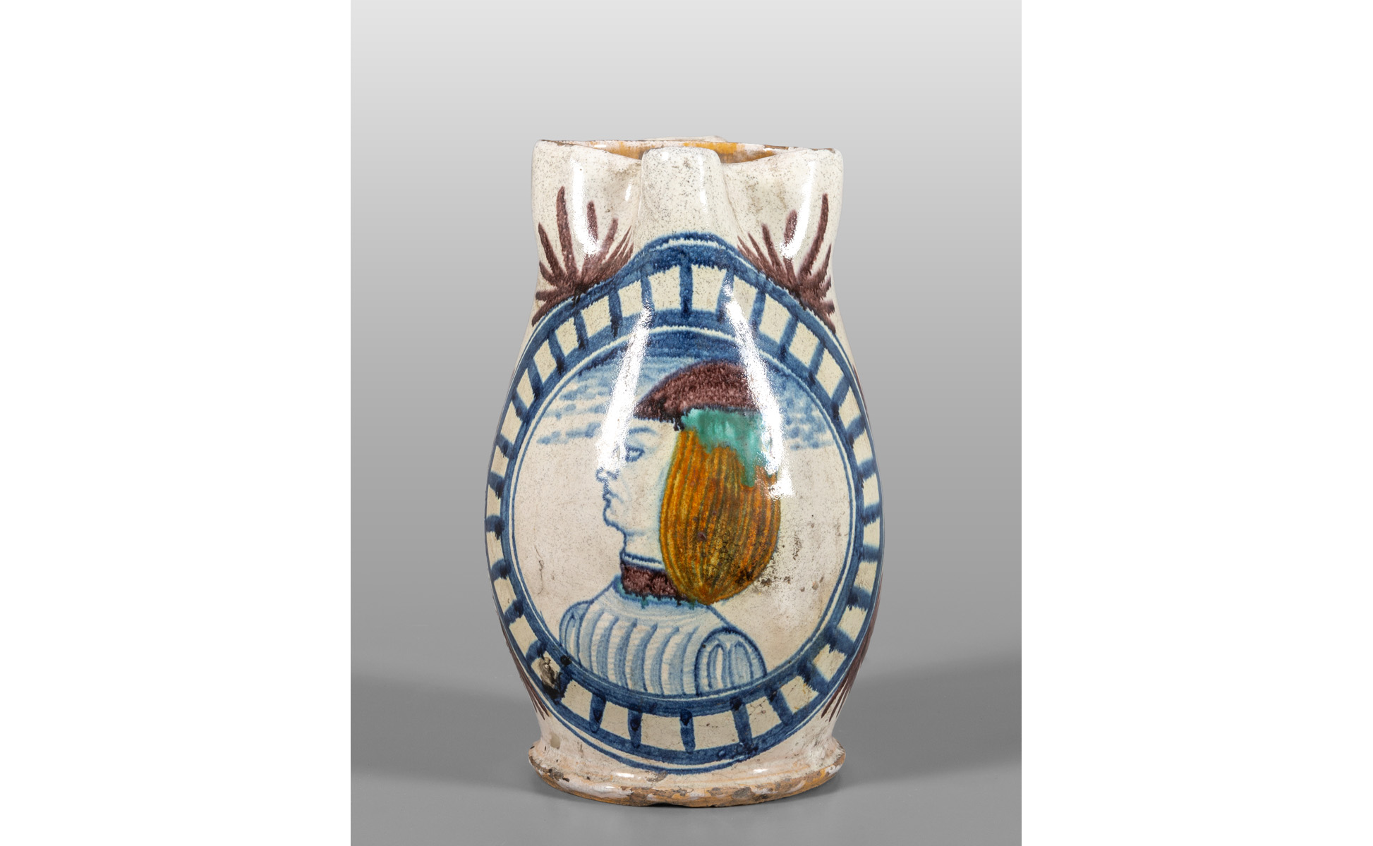 Boccale in maiolica policroma decorato con personaggio Faenza sec.XIX
