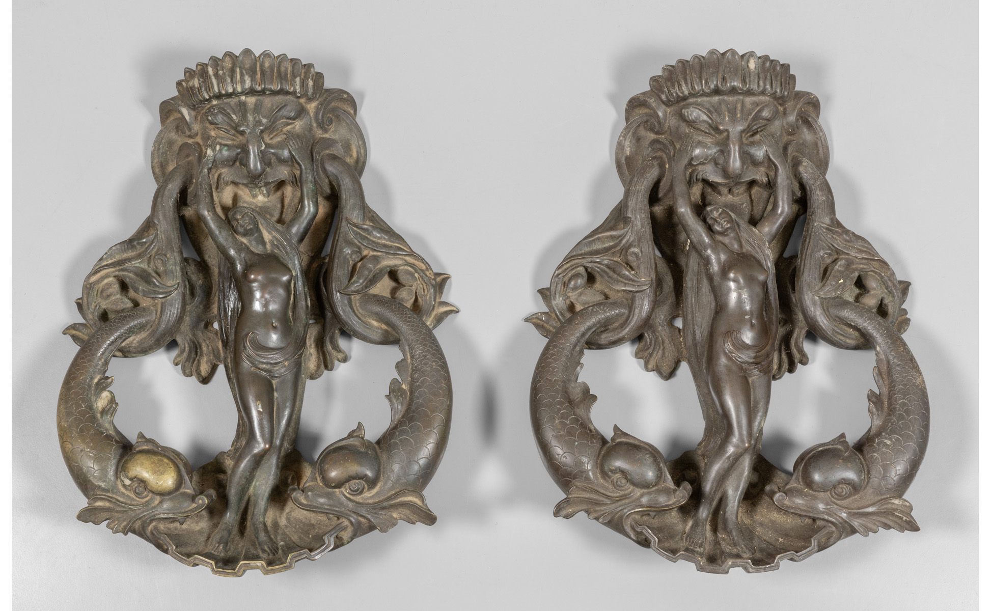Coppia di battenti in bronzo a patina scura raffiguranti personaggi femminili con delfini che sorreggono un mascherone Toscana sec.XIX