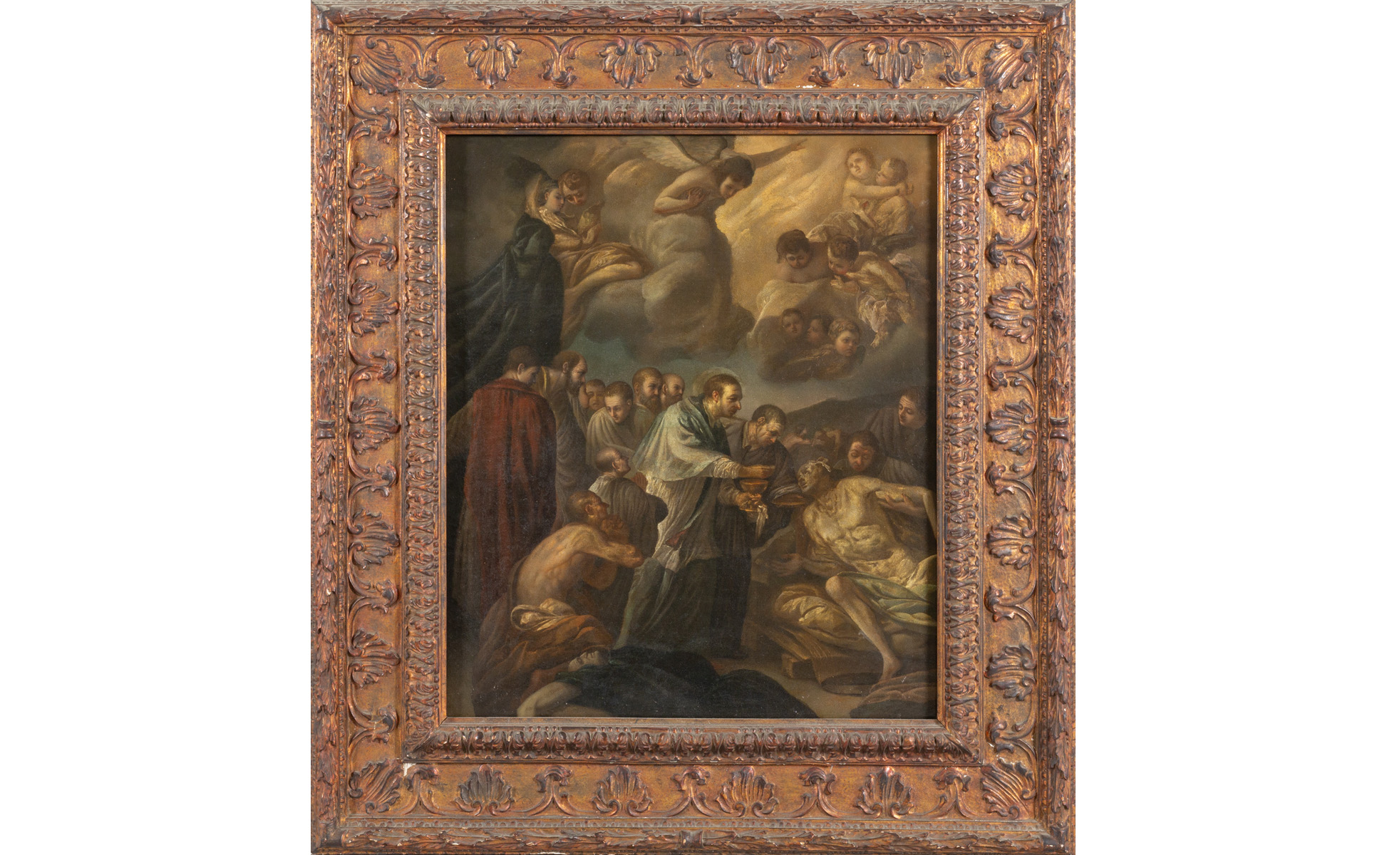 Scuola veneta sec.XVIII 'San Lorenzo che da l'Eucaristia' olio cornice in legno intagliato e dorato
