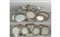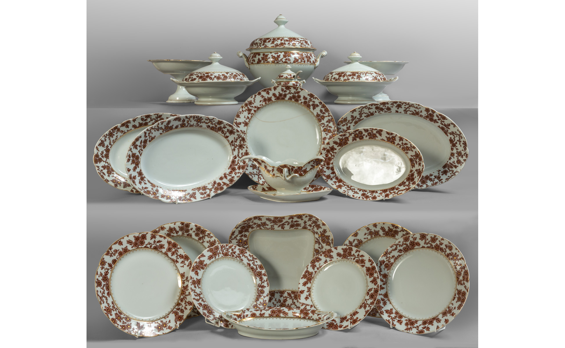 Servizio di piatti in porcellana Ginori con rami di fiori marroni e oro su fondo bianco inizi sec.XX composto da: 9 piatti fondi 44 piatti piani 17 piattini da frutta zuppiera con coperchio due legumiere con coperchio due alzate sei piatti ovali da portata due grandi piatti quadrati un grande piatto rotondo una salsiera un piatto ovale con manici una zuccheriera con piattino due tazze da ciocclata 4 piattini (difetti)