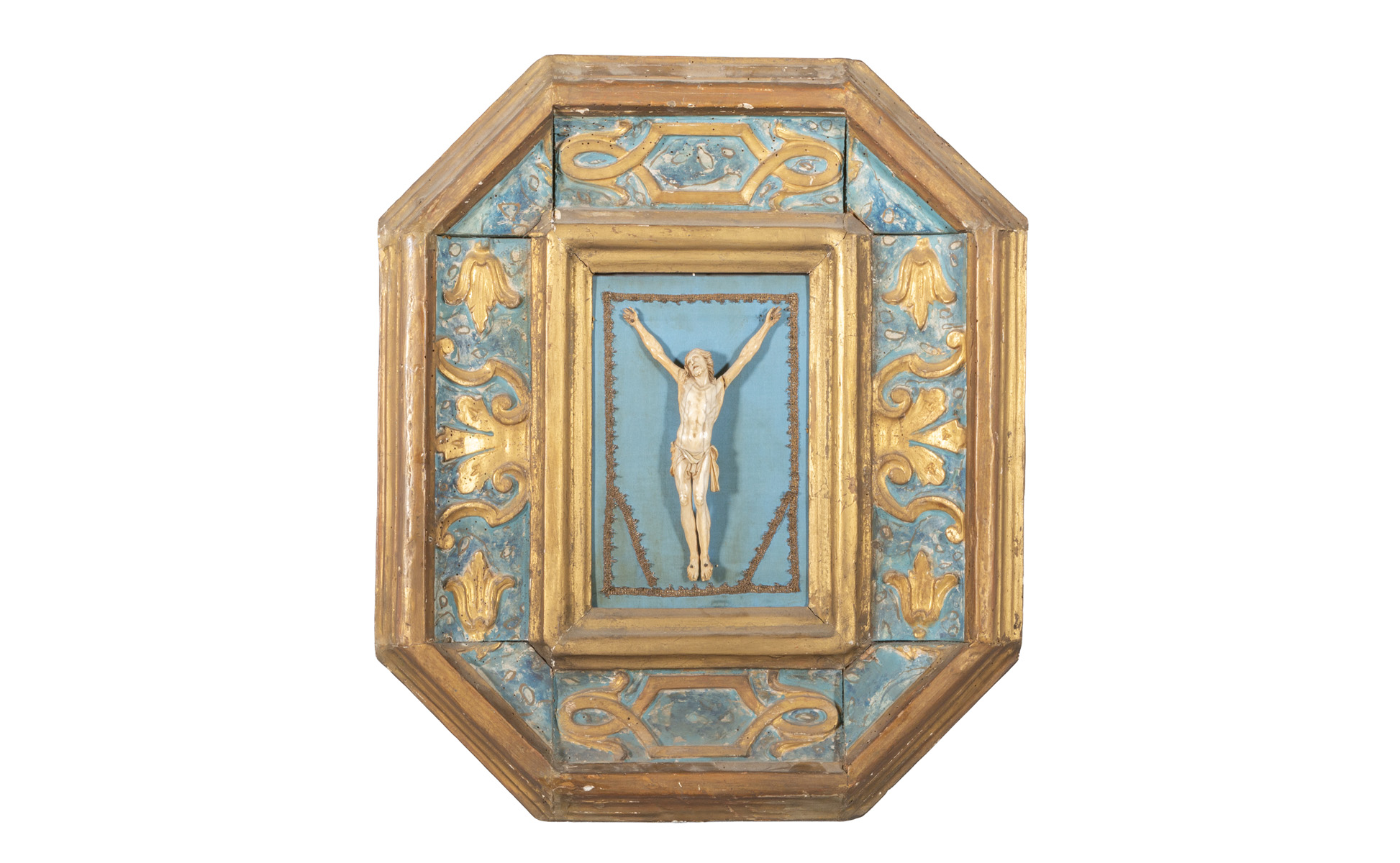 Cristo in avorio in cornice in legno intagliato e dorato Marche sec.XVII