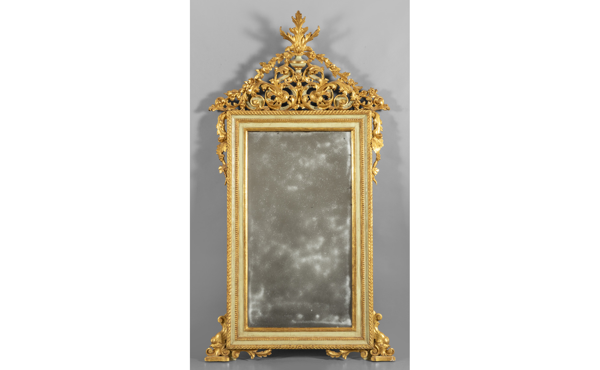 Specchiera in legno finemente intagliato dorato e laccato Toscana inizi sec.XIX