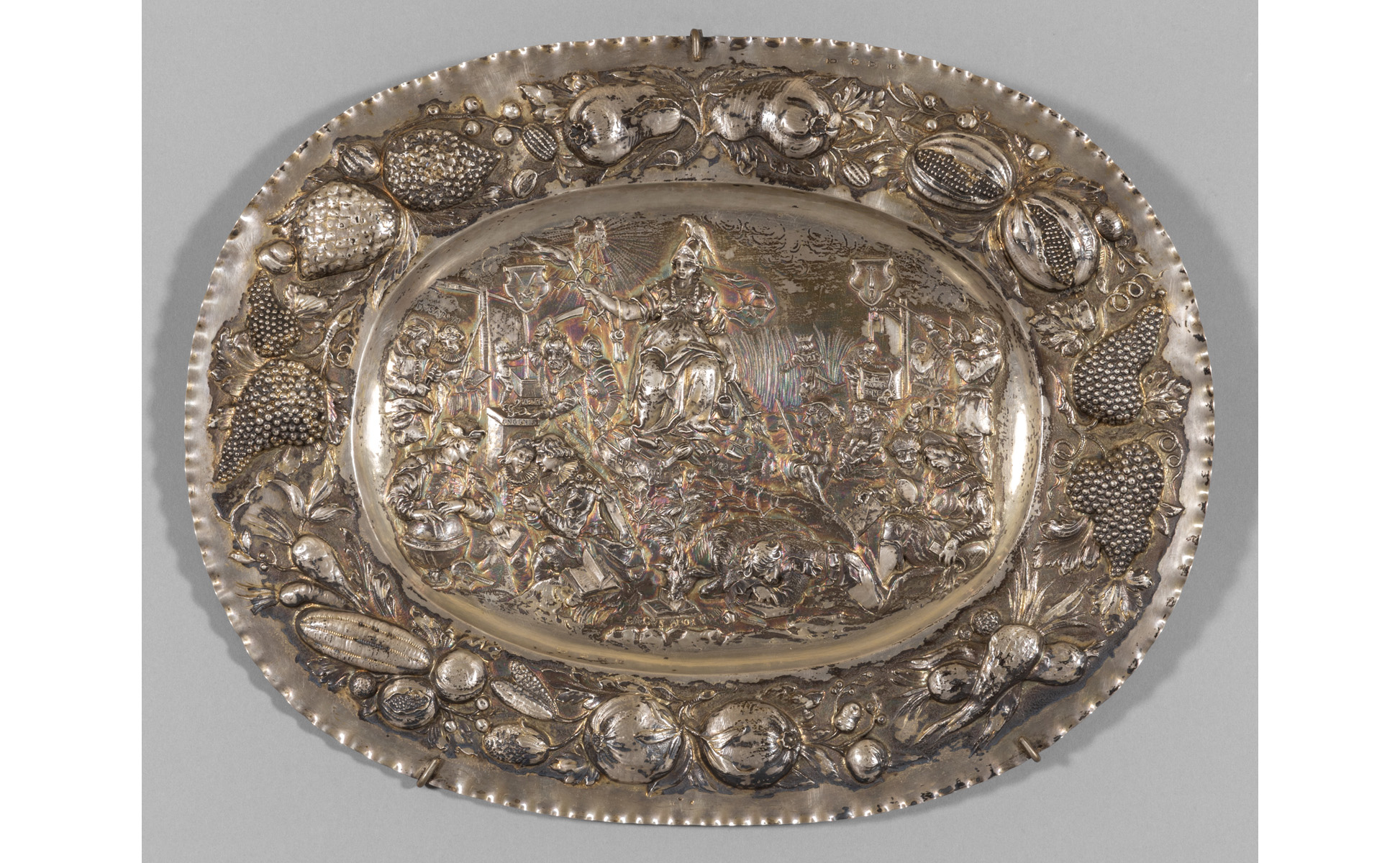 Grande vassoio ovale da parata in argento finemente bacellato con scena mitologica al centro e frutta nella fascia punzoni nella fascia sec.XX