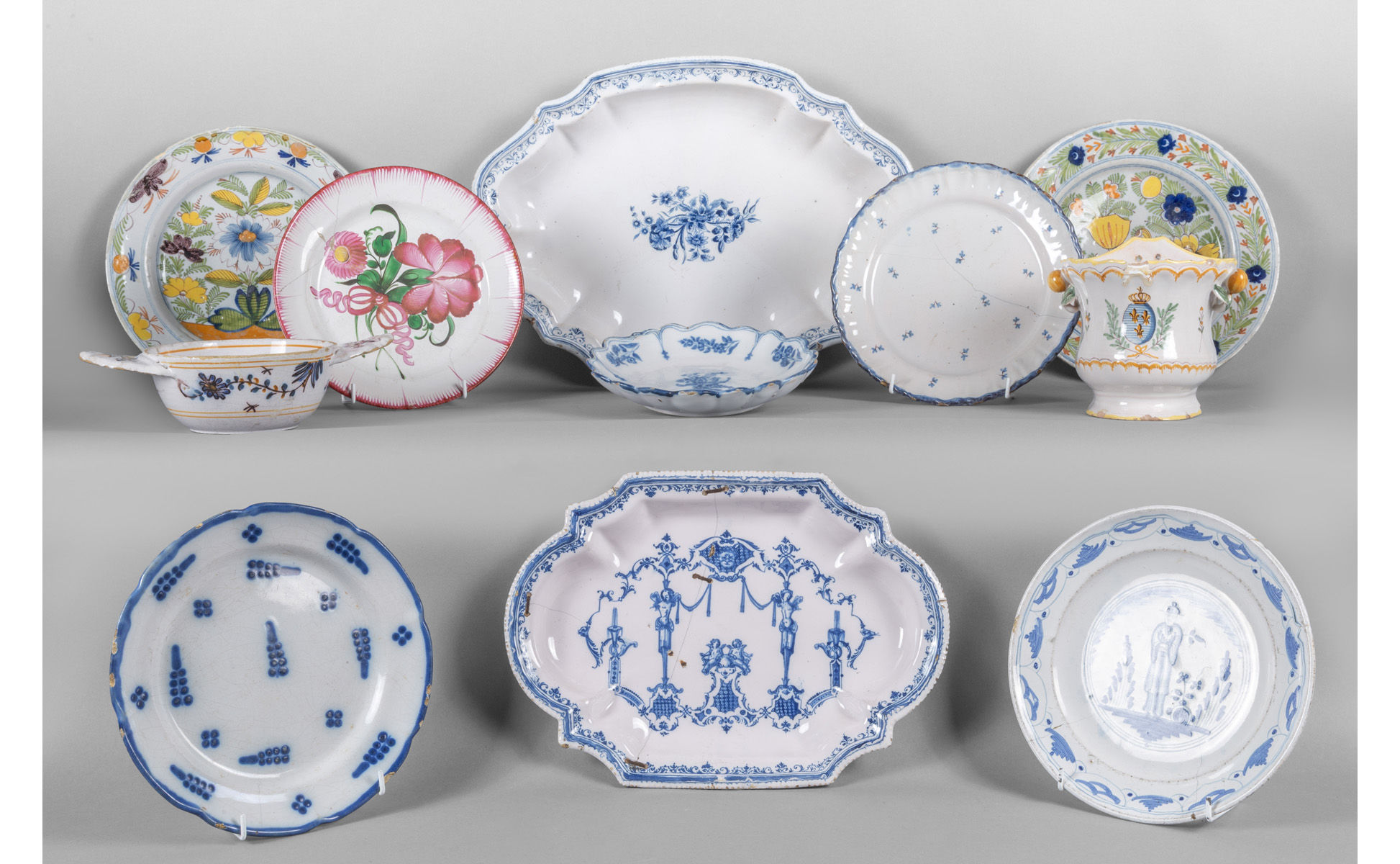 Sette piatti due vassoi un portafiori ed una tazza in ceramica policroma di varie manifatture ed epoche sec. XIX e XX difetti
