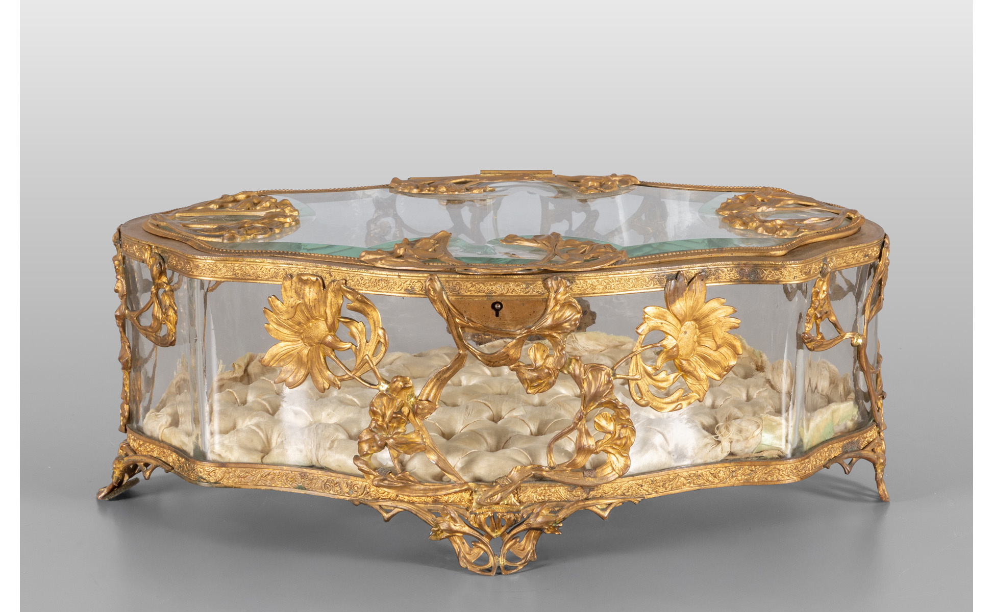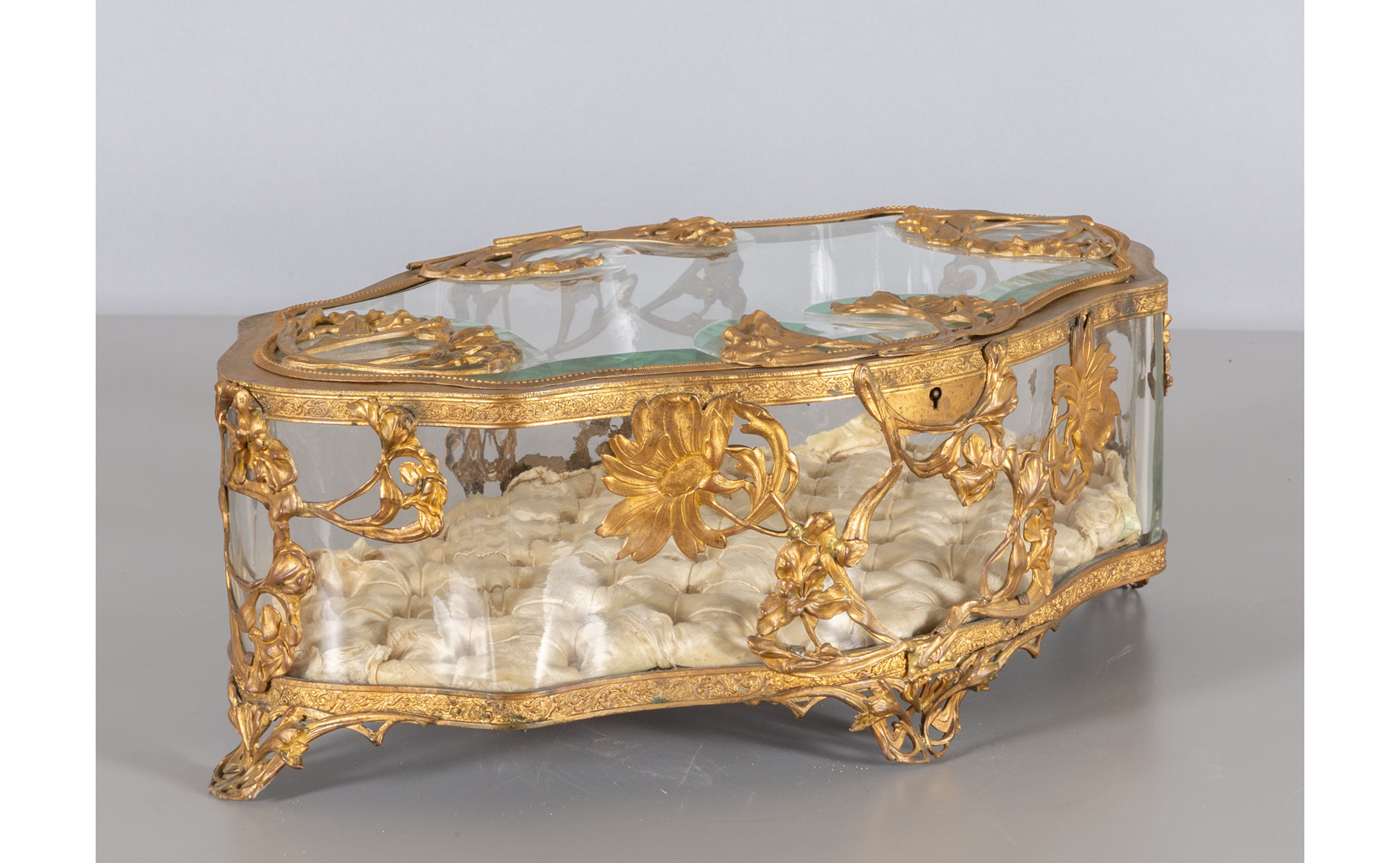 Grande scatola Liberty in vetro e bronzo dorato con fiori inizi sec.XX