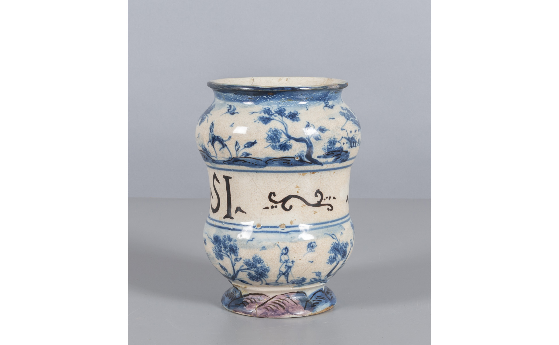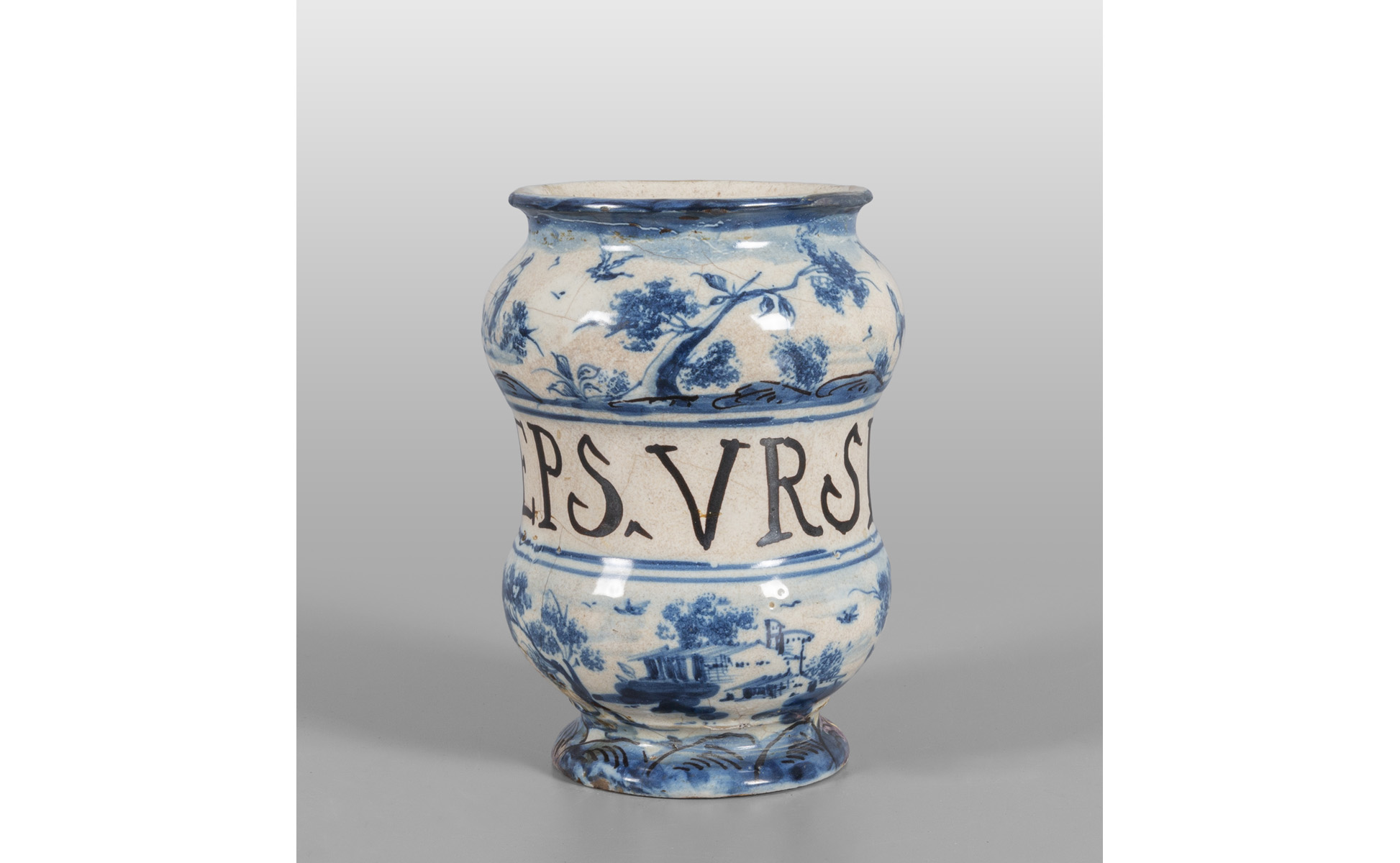 Albarello in ceramica bianca e blu decorato con paesaggi scritta medicinale ADEPES-URSI marca Giardino Savona sec.XVIII