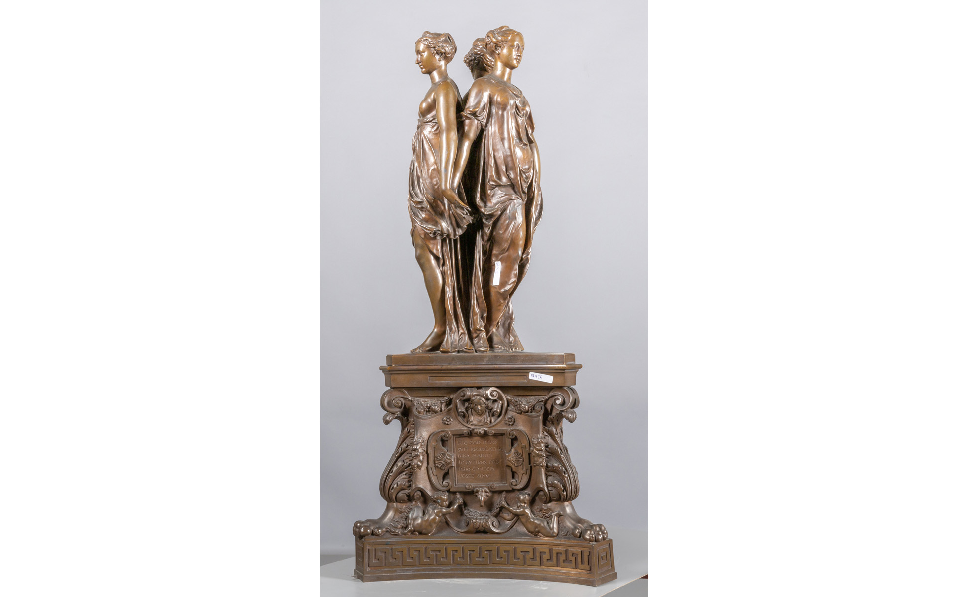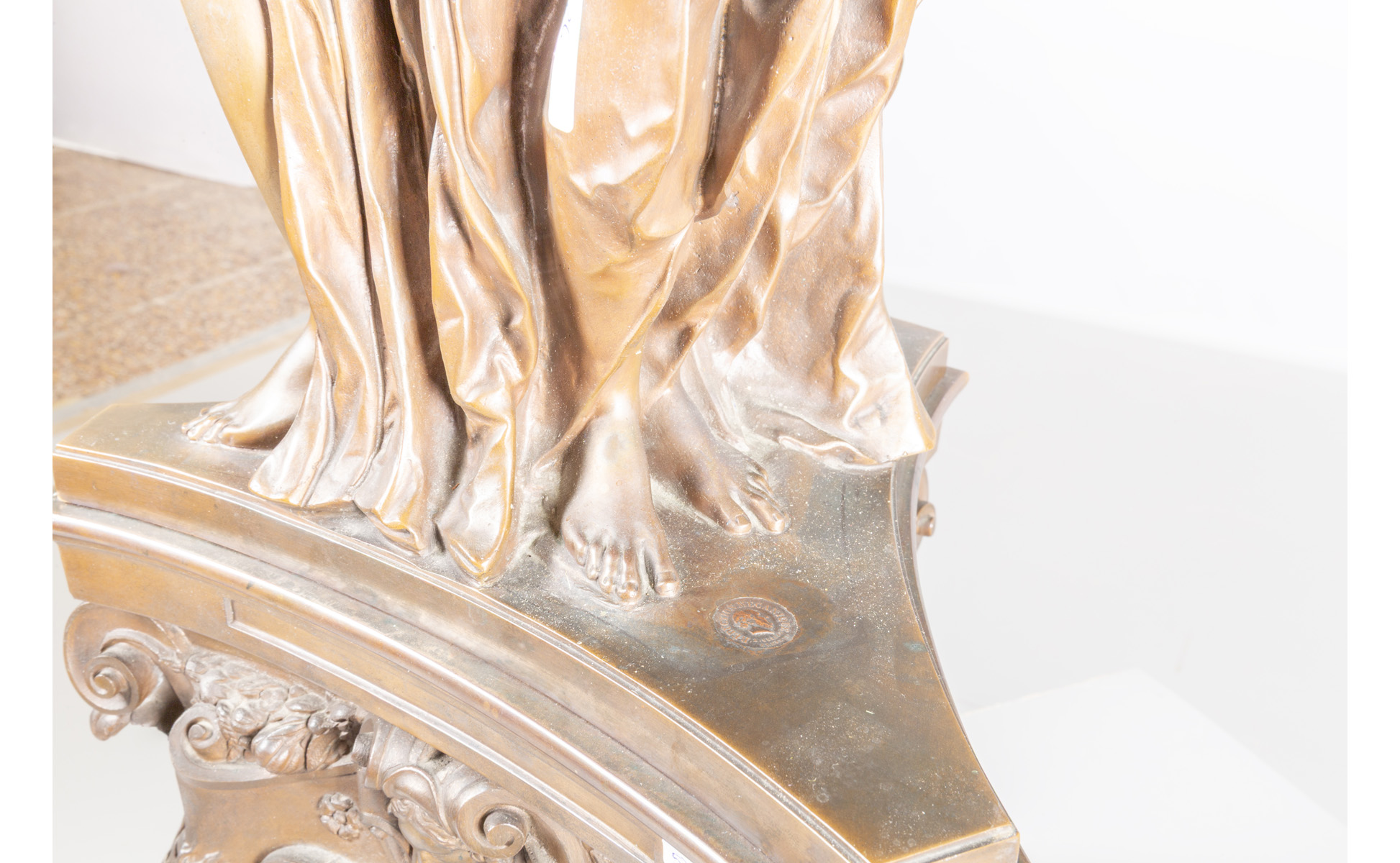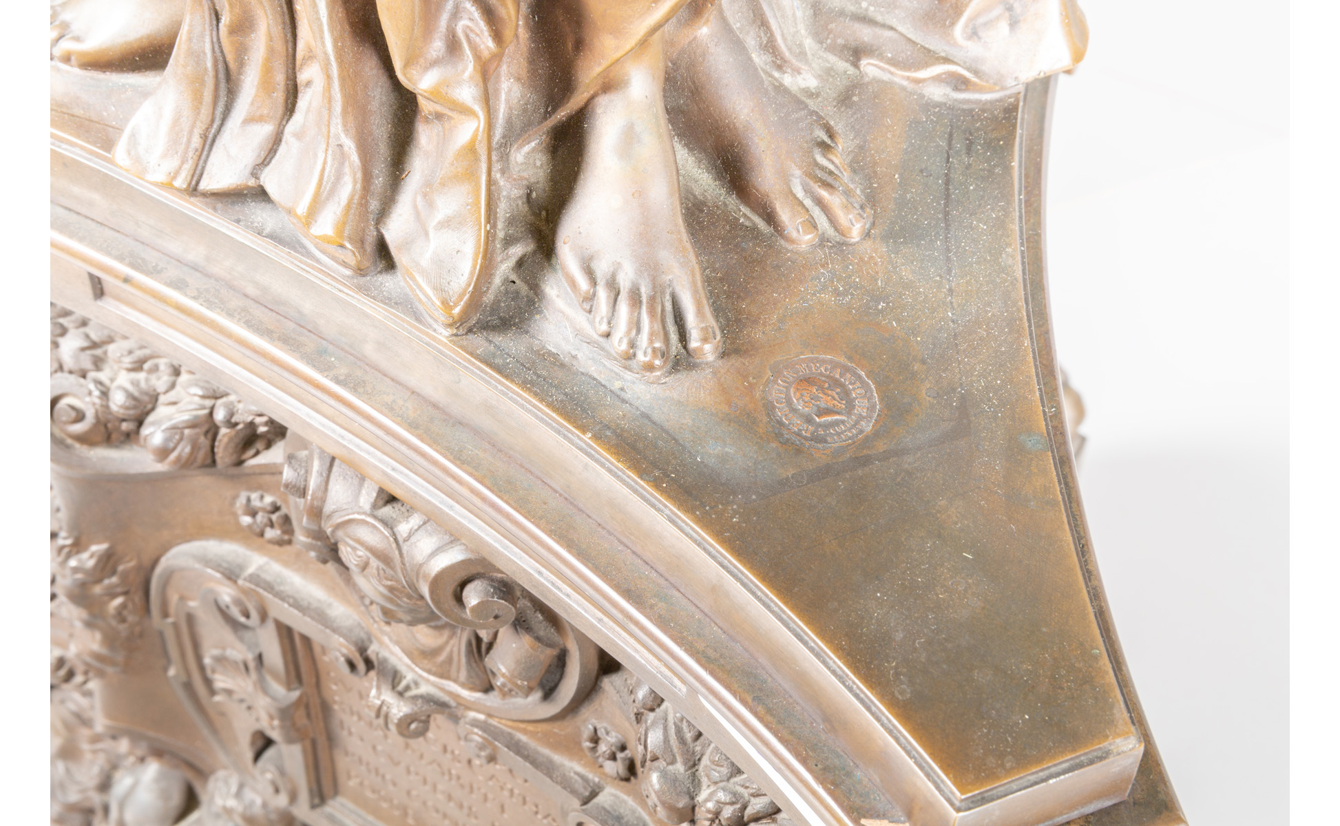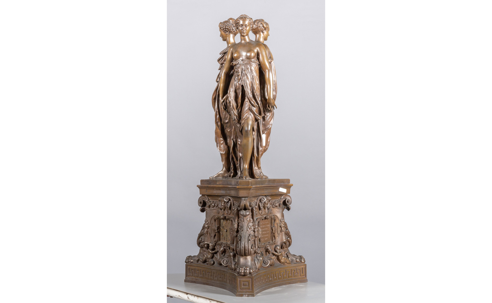 Grande orologio in bronzo base a capitello con zampe leonine putti e caproni parte superiore con le tre Grazie quadrante f.to F.Barririen Paris marchio con scritta 'Reduction meccanique A.Collas brevette' presente spesso in opere prodotte dalla fonderia Barbedienne Francia sec.XIX