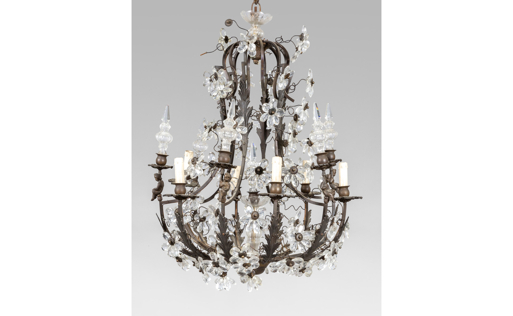 Lampadario a cestino a sei luci in bronzo con ricca decorazione in cristallo sec.XX