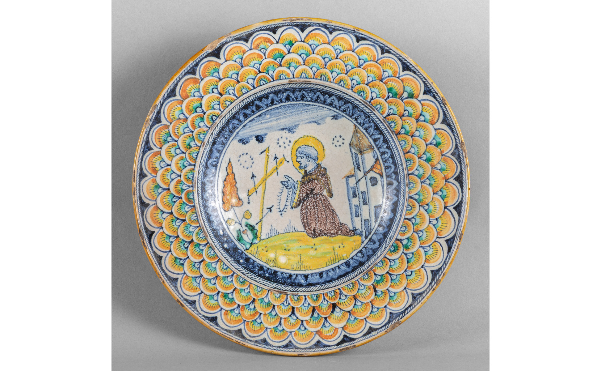 Piatto in maiolica decorato con figura di San Francesco sulla tesa decoro a pavone Deruta sec.XIX