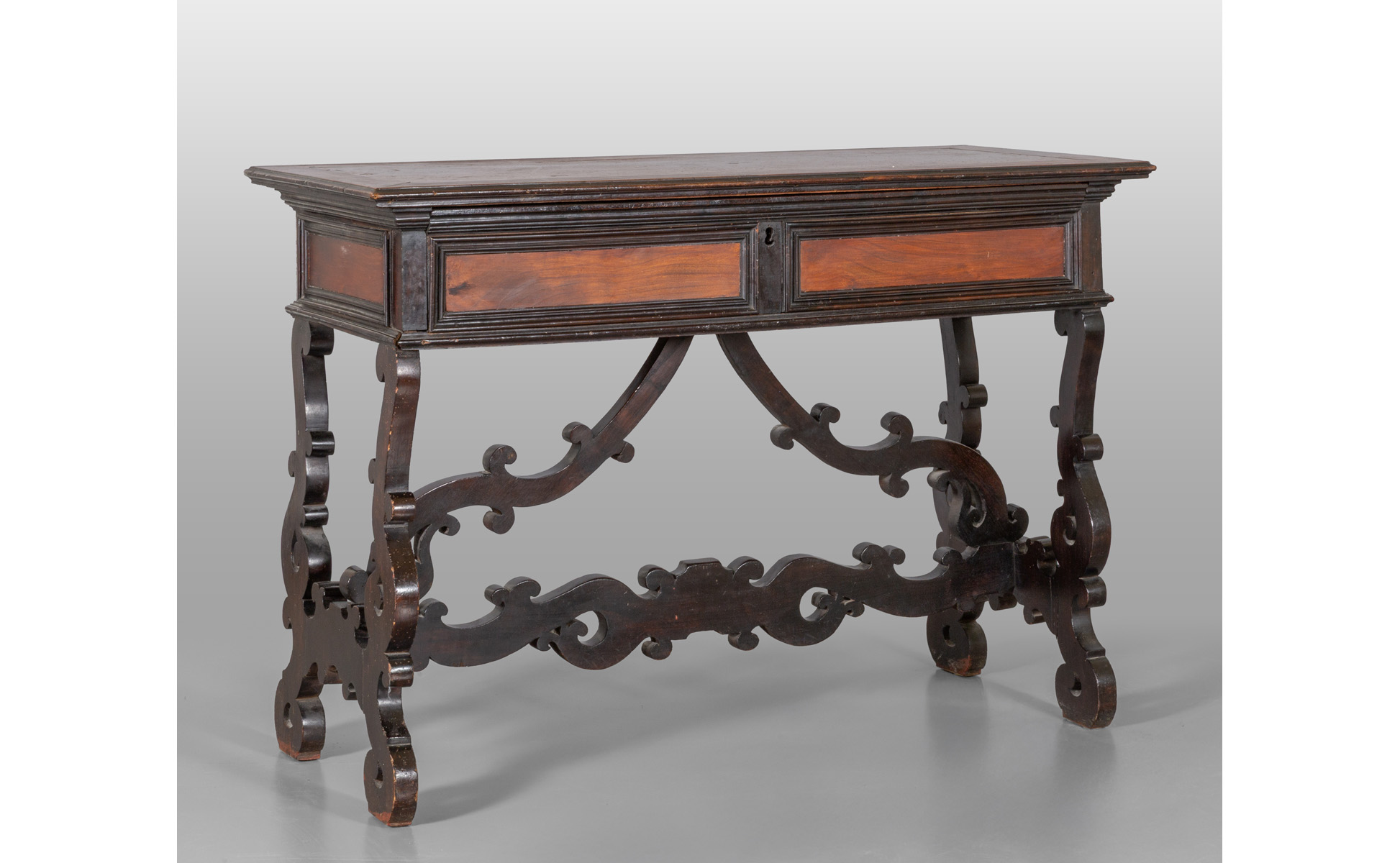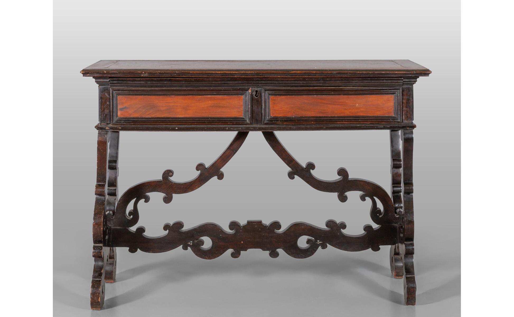 Scrivania Sanfilippo in noce con piano filettato gambe a lira Lombardia inizi sec.XVIII