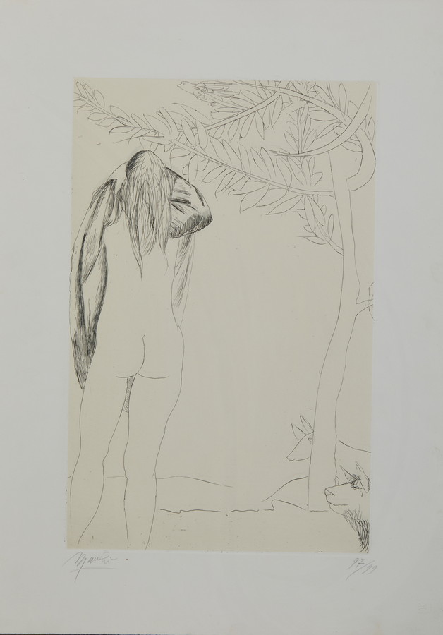 MANZU' GIACOMO (1908 - 1991) SENZA TITOLO. acquaforte. Cm 50,00 x 69,50. firma e tiratura a matita, es. 97/99, timbro a secco Alberto Caprini Stampatore