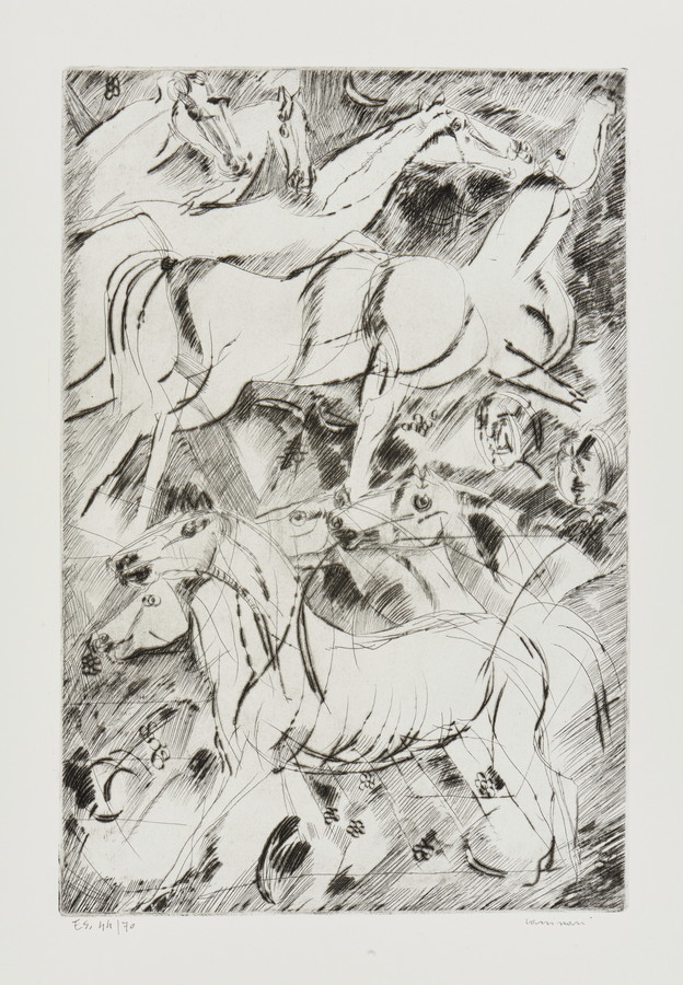CASSINARI BRUNO (1912 - 1992) CAVALLI IN LIBERTA'. Puntasecca. Cm 40,00 x 54,00. firma e tiratura a matita, es. 44/70,
