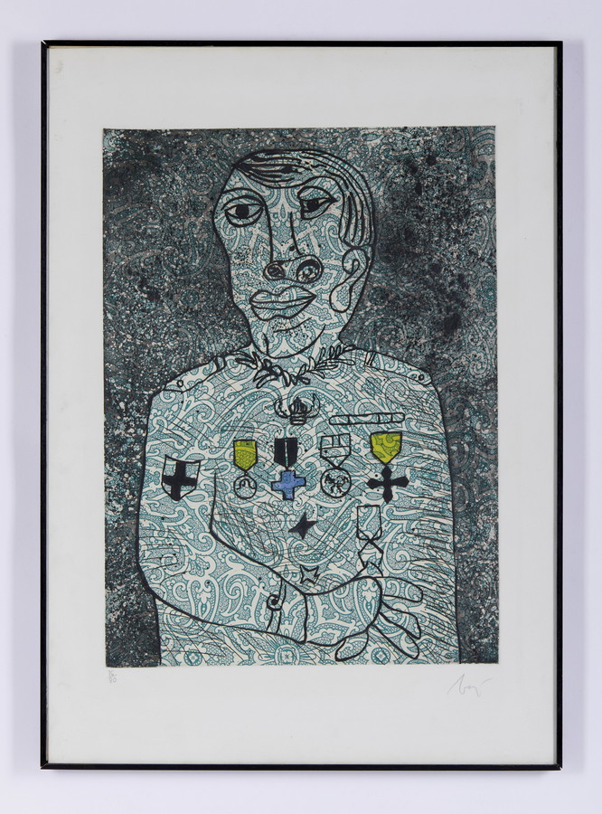 BAJ ENRICO (1924 - 2003) PERSONNAGE DE GUERRE. 1971. acquaforte. Cm 50,00 x 70,00. Firma e tiratura a matita, es. 36 /80