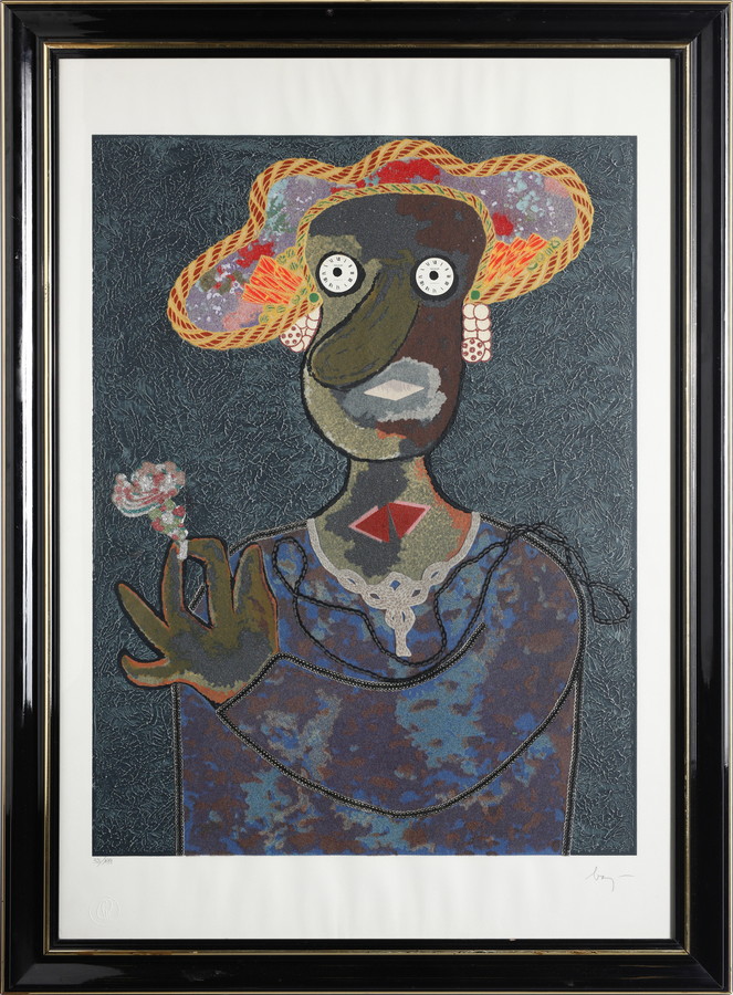 BAJ ENRICO (1924 - 2003) PERSONAGGIO. Serigrafia e collage. Cm 70,00 x 100,00. firma e tiratura a matita, es. 32/199, timbro a secco