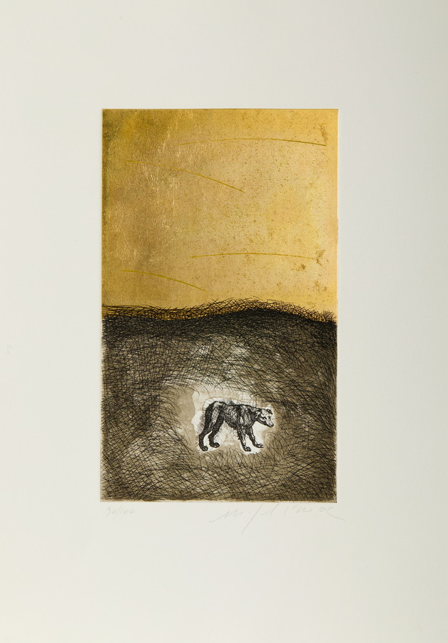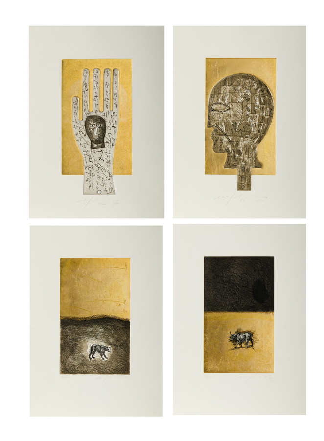 PALADINO MIMMO (n. 1948) CARTELLA COMPOSTA DA N. 4 FOGLI. SENZA TITOLO (MANO, TORO, CANE E TESTA). 2002. acquatinta-acquaforte con foglia d'oro. Cm 35,00 x 50,00. firma, data e tiratura a matita, es. 90/100