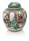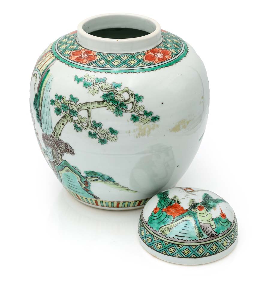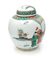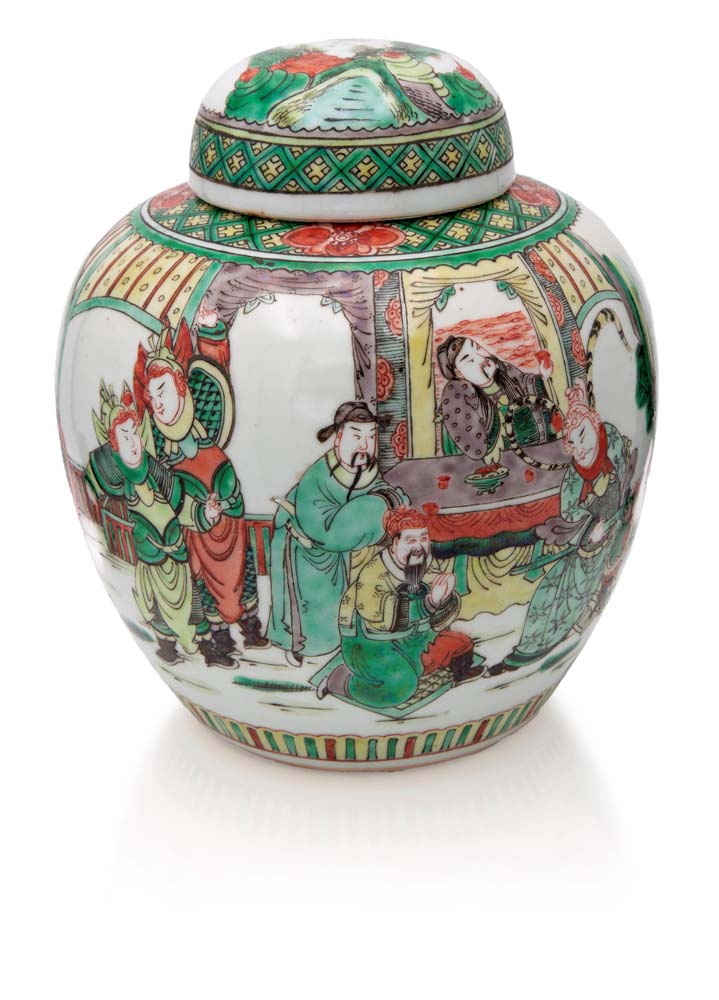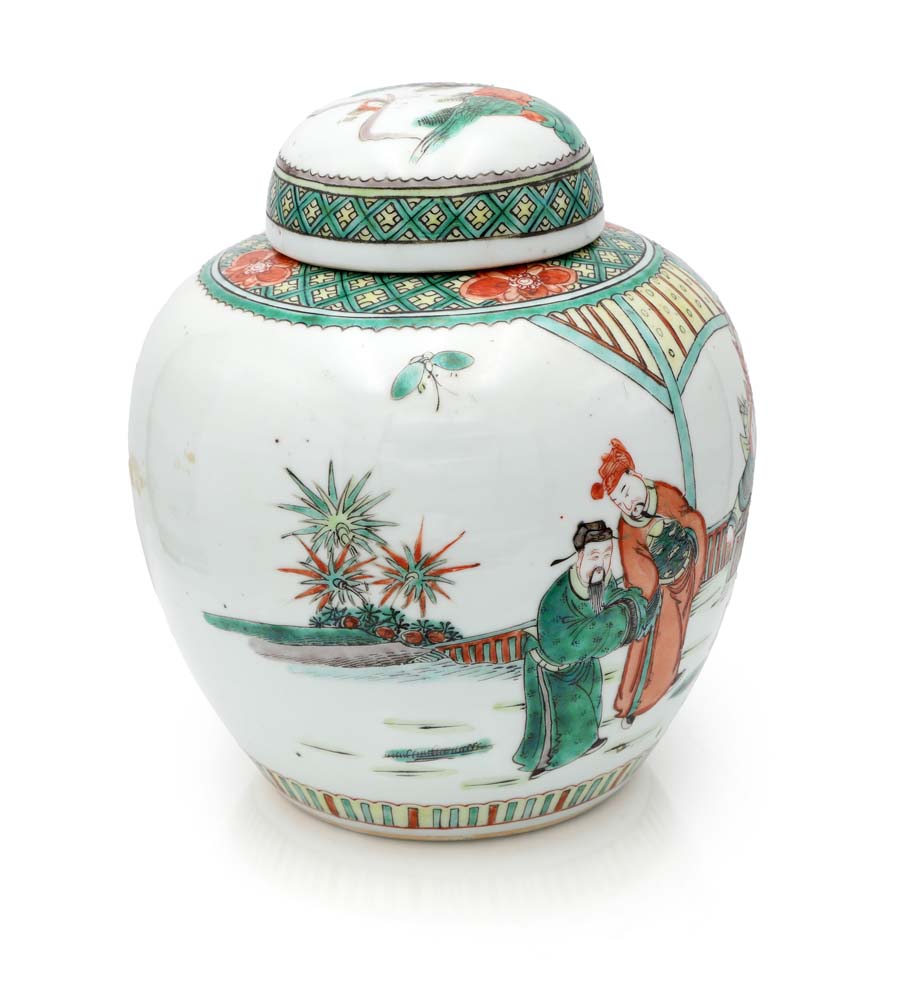 Piccolo ginger jar in porcellana policroma, Cina, dinastia Qing, XIX secolo corpo globulare con coperchio a cupolino, decorato a smalti policromi secondo il repertorio della famiglia verde, a raffigurare una scena figurata continua con personaggi di corte e dignitari in ambiente architettonico, resa con segno nitido e vivace cromia dominata da verdi, rossi ferrosi e gialli. Fasce geometriche e floreali delimitano la composizione; il coperchio riprende il medesimo impianto decorativo. Esemplare riconducibile alla produzione cinese destinata all’esportazione per il mercato occidentale. altezza cm 20,5