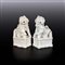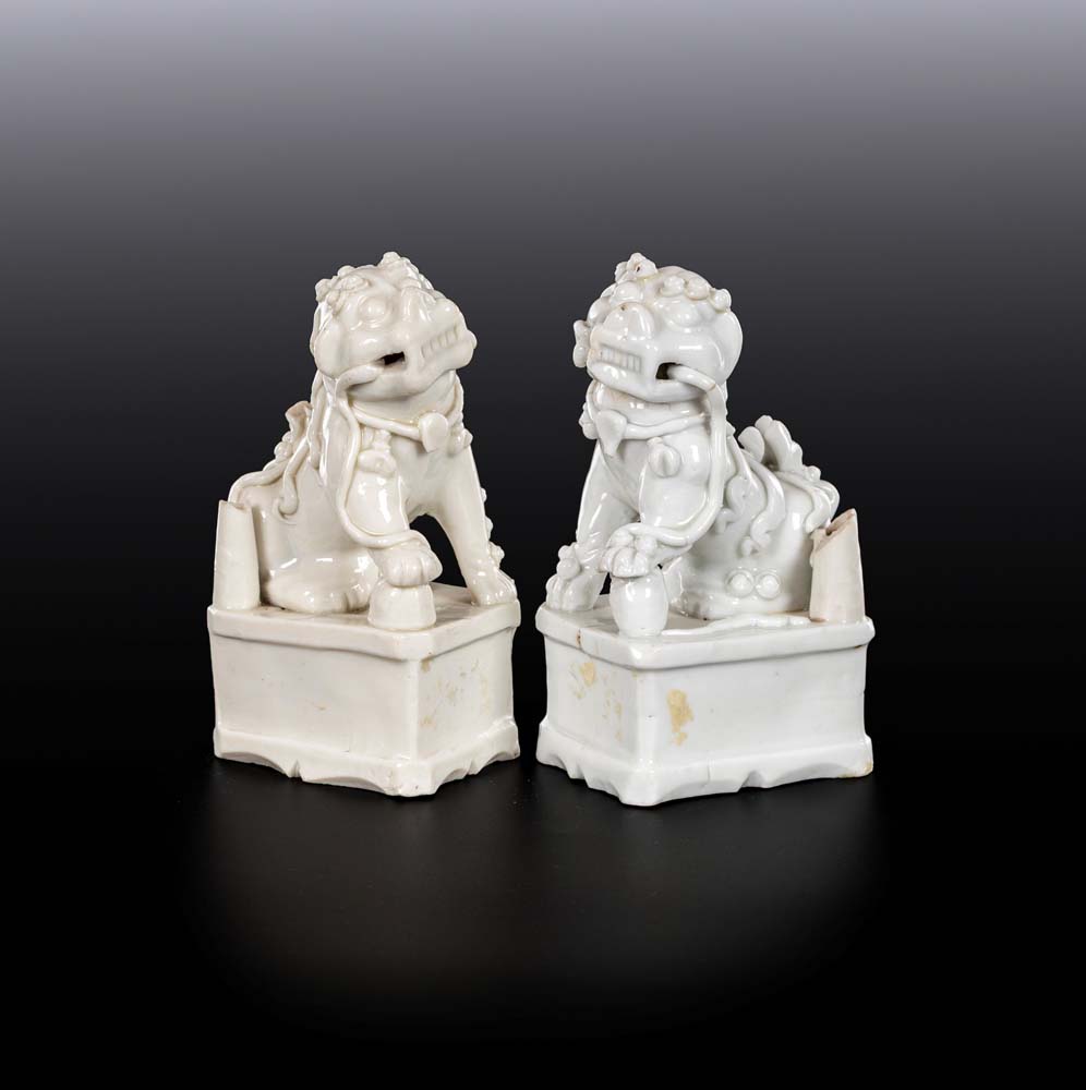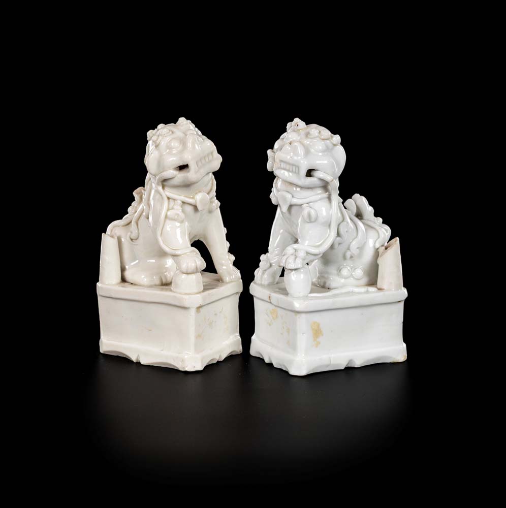 Coppia di cani di Pho in porcellana bianca, Cina, dinastia Qing, XIX secolo entrambe di genere maschile, ritratti per essere disposti "vis à vis" con sfera rispettivamente sotto la zampa anteriore destra e sinistra su alti piedistalli rettangolari. Recano contenitori cilindrici porta incensi danneggiati. Lievi difetti, rotture e mancanze cm 14x9x6