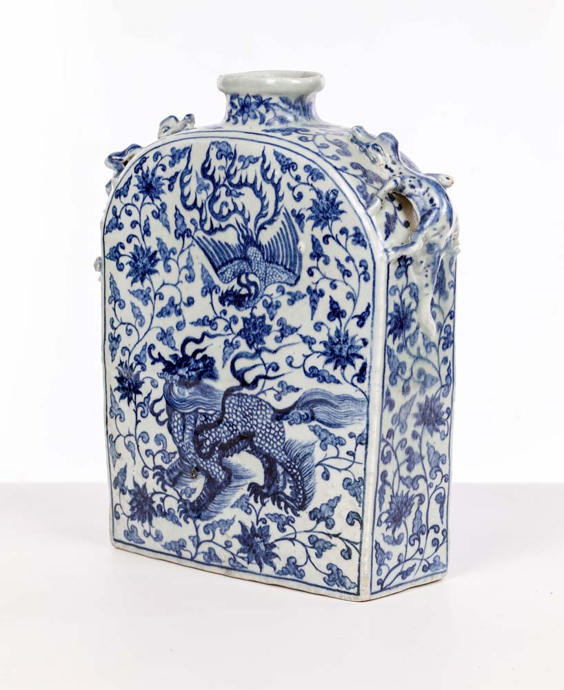 Fiasca in porcellana bianca e blu, Cina, dinastia Qing, XIX secolo corpo rettangolare appiattito, con spigoli superiori arrotondati sormontati da anse zoomorfe e collo cilindrico breve. La superficie è interamente decorata in blu sotto vetrina con una ricca composizione a motivi vegetali e nuvole stilizzate secondo un repertorio iconografico tipico della produzione decorativa ottocentesca, in cui spicca un qílín colto in movimento e nella parte superiore una fenice in volo cm 30x26x8