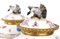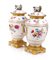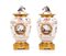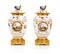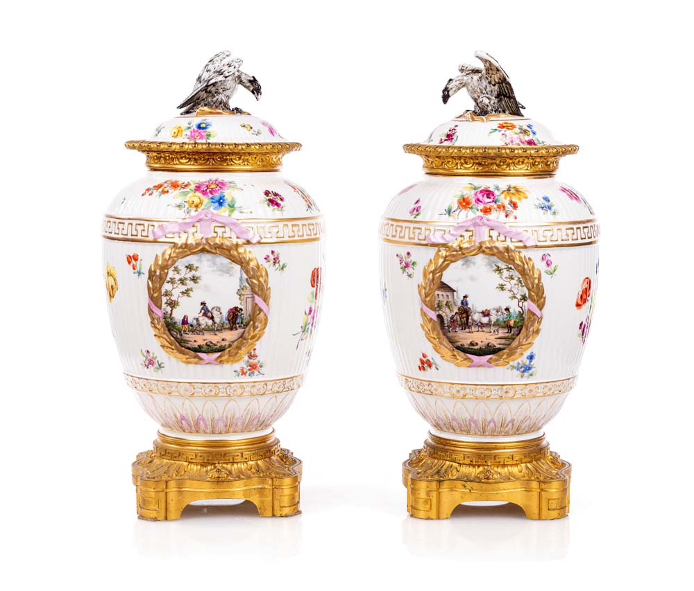 Coppia di vasi con coperchio in porcellana bianca con fiori policromi e bronzo dorato, Germania, XIX secolo corpo ovoidale centrato da miniature circolari raffiguranti paesaggi con figure a cavallo racchiuse da una ghirlanda d'alloro modellata in rilievo e dorata; tutt'intorno si dispongono motivi floreali multiformi e variopinti, interrotti da una cintura apicale con motivo a greca e cintura basale con minuti motivi floreali resi in rilievo; coperchio sormontato da rapace. Sostegno ad anello in bronzo dorato su base quadrangolare altezza cm 48