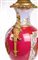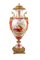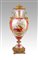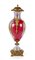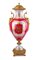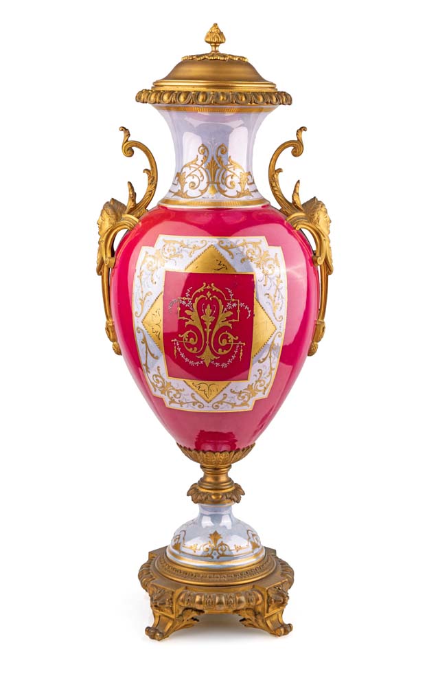 Grande vaso in porcellana di Sèvres rosso porpora con figure mitologiche policrome e montatura in bronzo dorato, Francia, XIX secolo facciata caratterizzata da una allegoria della musica alla maniera di François Boucher circondata da quattro medaglioni dorati con profilo perlinato, raffiguranti ognuno un volto mitologico dipinto in vivace policromia (Mercurio, Cibele, Ercole e Bacco); la facciata posteriore è decorata da pannelli geometrici sovrapposti. Coperchio, anse e base in bronzo dorato altezza cm 75