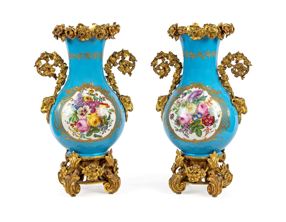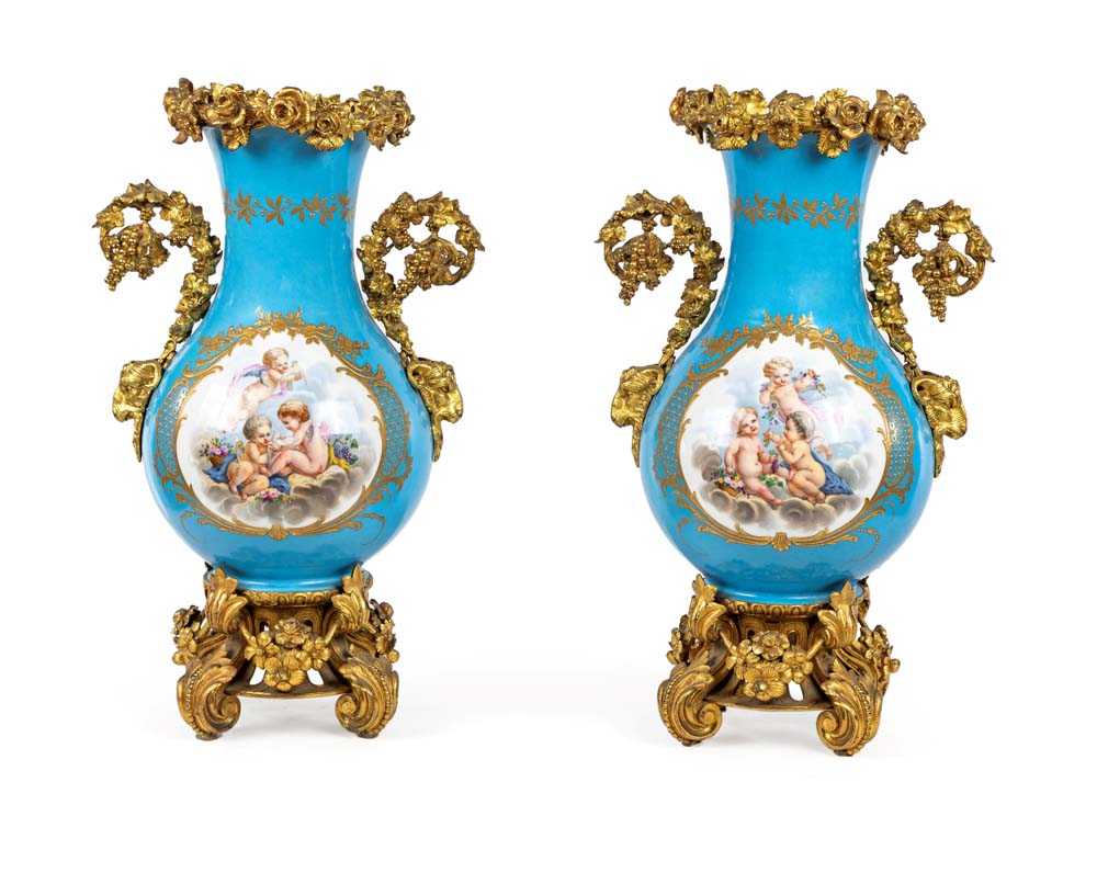 Coppia di vasi in porcellana di Sèvres e bronzo dorato, Francia, prima metà del XIX secolo corpo ad anfora fondo turchese lumeggiato in oro, decorato da figure di amorino entro bordura dorata a motivi vegetali, cui corrisponde una vivace composizione di fiori multiformi e variopinti diametralmente opposta; sui lati teste d'ariete in bronzo dorato dalla cui sommità si erge un lungo stelo terminante a ricciolo su cui si avvolgono tralci di vite con grappoli d'uva. Orlo superiore percorso da rose in bronzo dorato; sostegno a rocchetto sorretto da motivi vegetali riuniti da ghirlande fiorite.