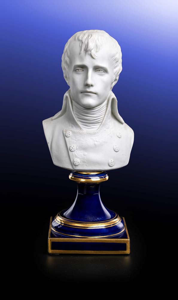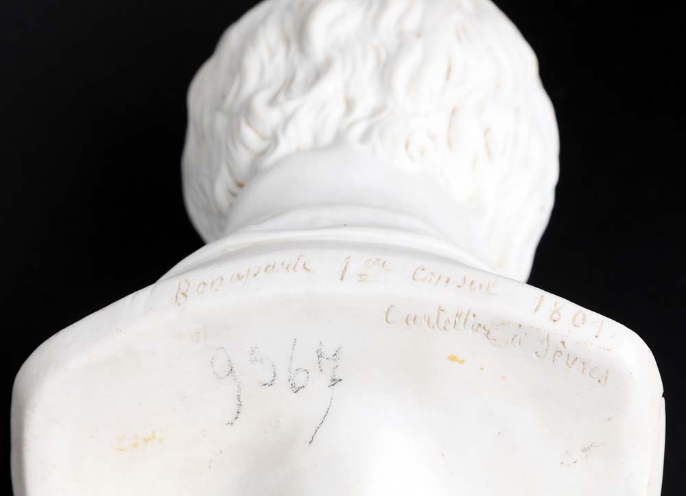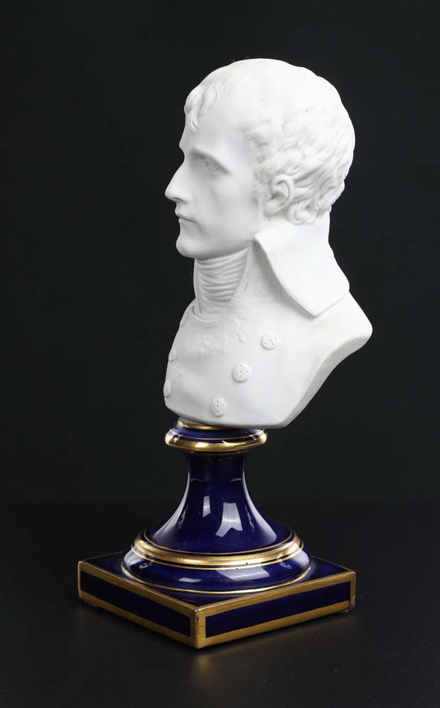 Pierre Cartellier (Parigi 1757 - Parigi 1831) Busto di Napoleone in uniforme da Primo Console, manifattura di Sèvres, XIX secolo Titolo, data e firma al verso, lungo il profilo delle spalle: "Bonaparte, 1er Consul 1801 / Cartellier à Sèvres" biscuit e porcellana blu e oro altezza cm 27