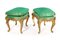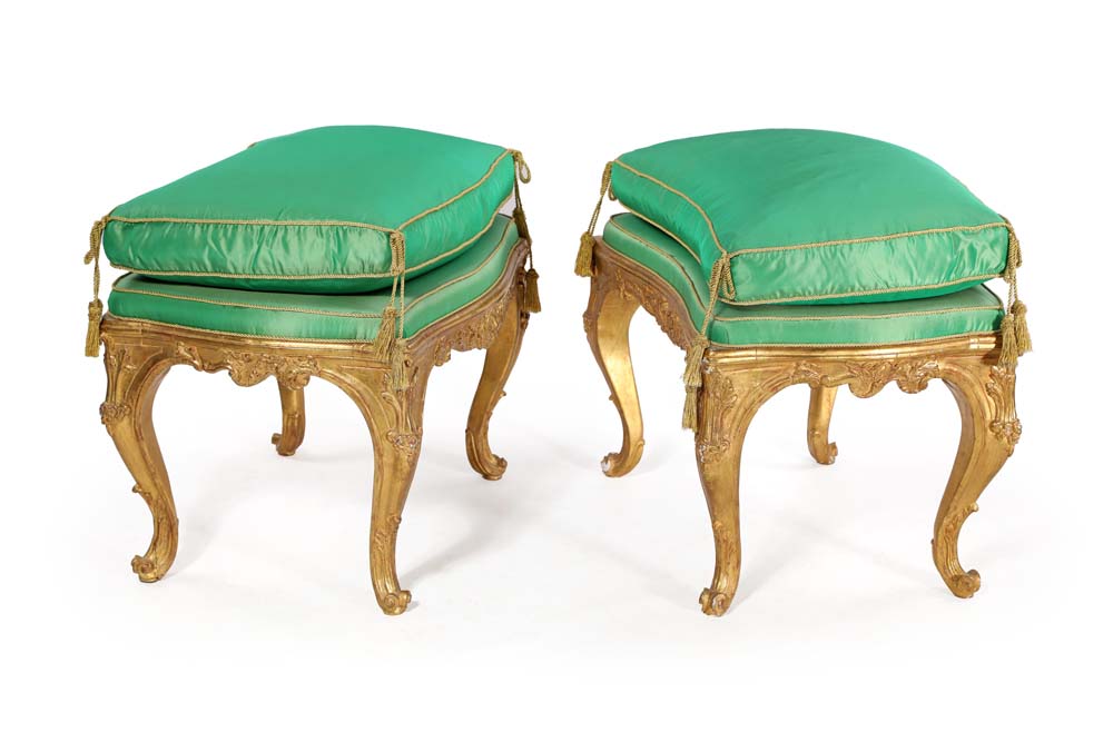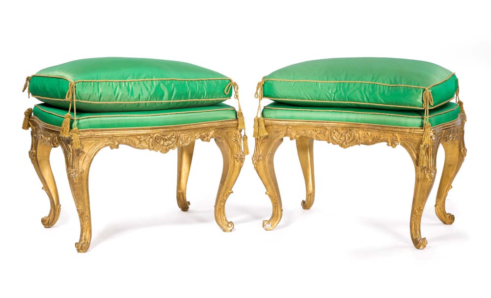 Coppia di panchetti in legno intagliato e dorato, XVIII secolo di forma rettangolare, recano sedute complementari con un lato di linea lievemente convessa cui corrisponde sull'altro panchetto un lato leggermente concavo; rifinite in seta verde con cuscini abbinati, hanno fascia centrata da conchiglia affiancata da motivi vegetali, elementi decorativi ripresi lungo la curvatura delle gambe cm 45x63x46 - col cuscino altezza cm 56