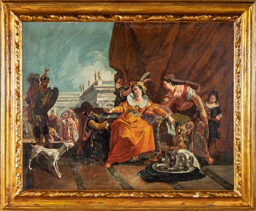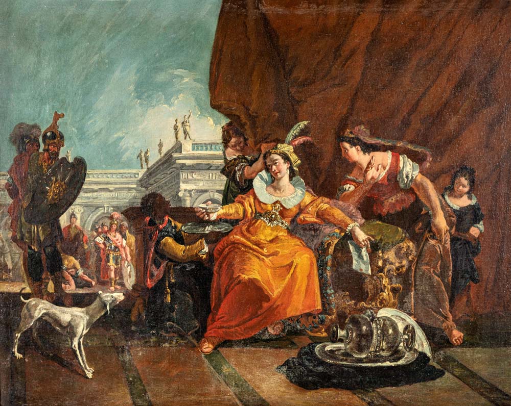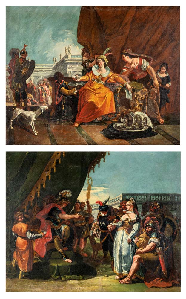 Francesco Fontebasso (bottega di) (Venezia 1707 - Venezia 1769) a) Sofonisba; b) Clemenza di Scipione Allievo di Sebastiano Ricci, Francesco Fontebasso assimilò profondamente l’influenza di Giambattista Tiepolo, affermandosi tra i principali protagonisti del Settecento veneziano. Determinante fu l’incontro con Tiepolo nei primi anni Trenta, probabilmente durante la collaborazione agli affreschi del Palazzo Patriarcale di Udine. La prima grande commissione per la chiesa dei Gesuiti a Venezia (1734) sancì il suo successo, aprendo la strada a prestigiosi incarichi presso l’aristocrazia veneziana.