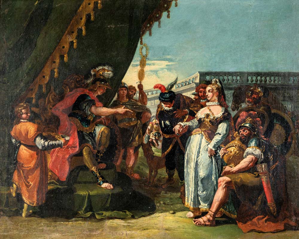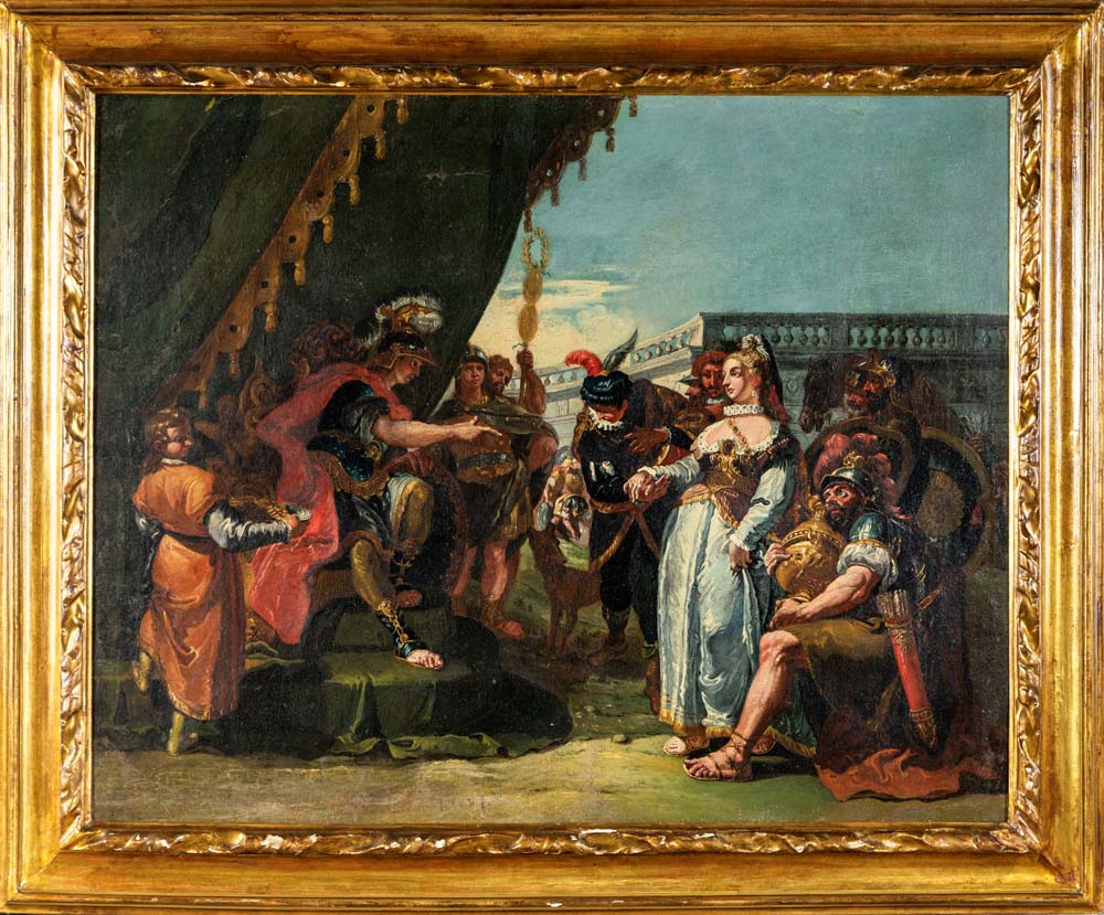 La scena ispirata all’episodio della clemenza di Publio Cornelio Scipione, generale romano noto per la magnanimità verso i nemici sconfitti, cattura un momento di clemenza e perdono, enfatizzando valori morali quali giustizia, pietà e grandezza d’animo tipici della Roma antica. coppia di olii su tela entrambi cm 77,5x95,5 - con cornice cm 94,5x114 Bibliografia di riferimento: