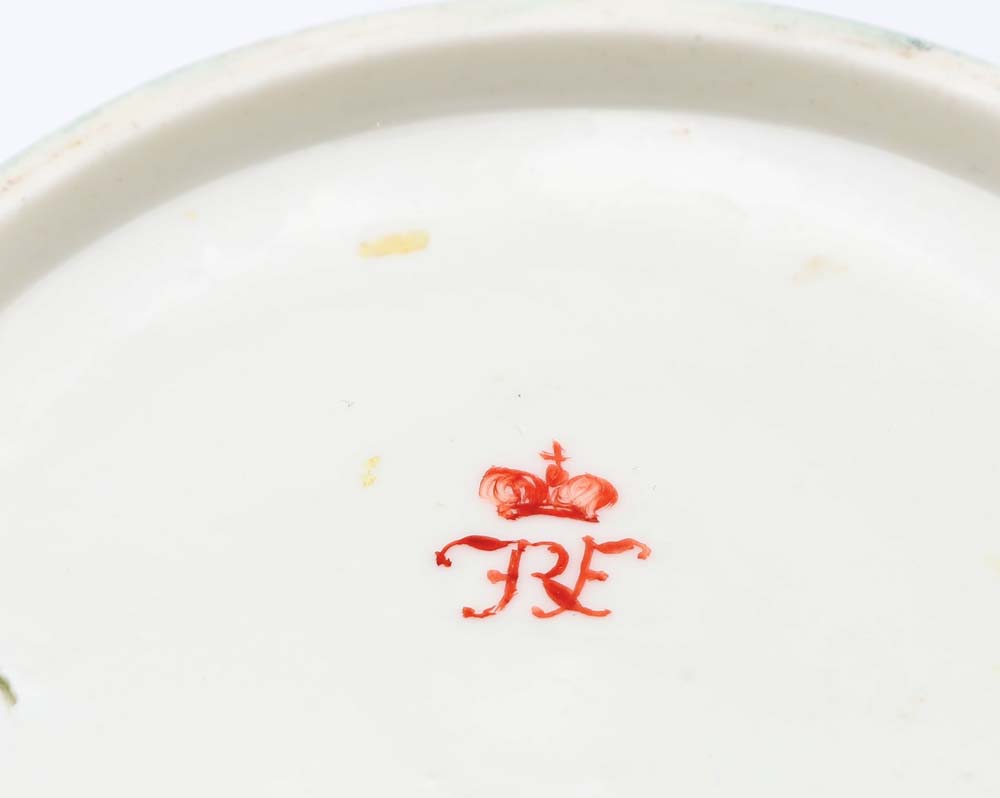 Tazza da brodo in porcellana con coperchio e decoro "alla rosa", Real Fabbrica Ferdinandea, Napoli, fine del XVIII secolo decorata da bouquet con rose; profili in verde e oro; manici dorati; coperchio sormontato da un frutto. Marca in rosso. Lievi difetti e piccole mancanze cm 14x17x13