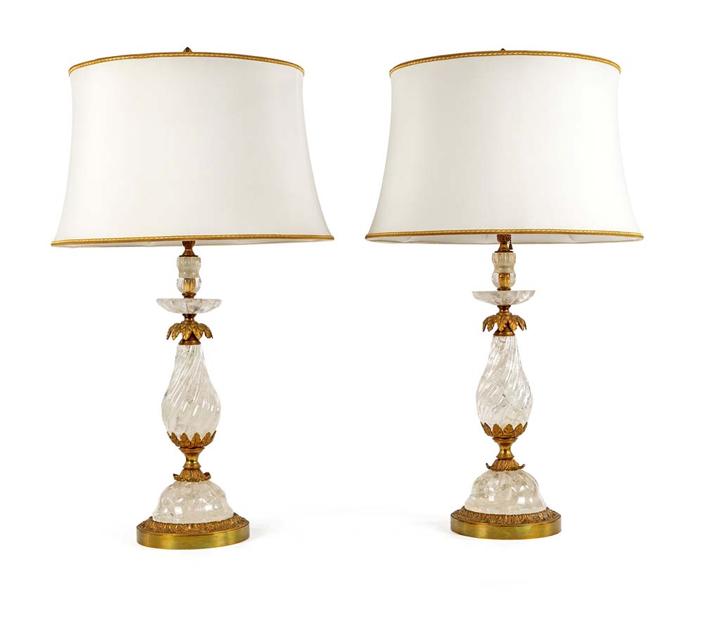 Coppia di lampade da tavolo in cristallo di rocca e bronzo dorato, XIX secolo...