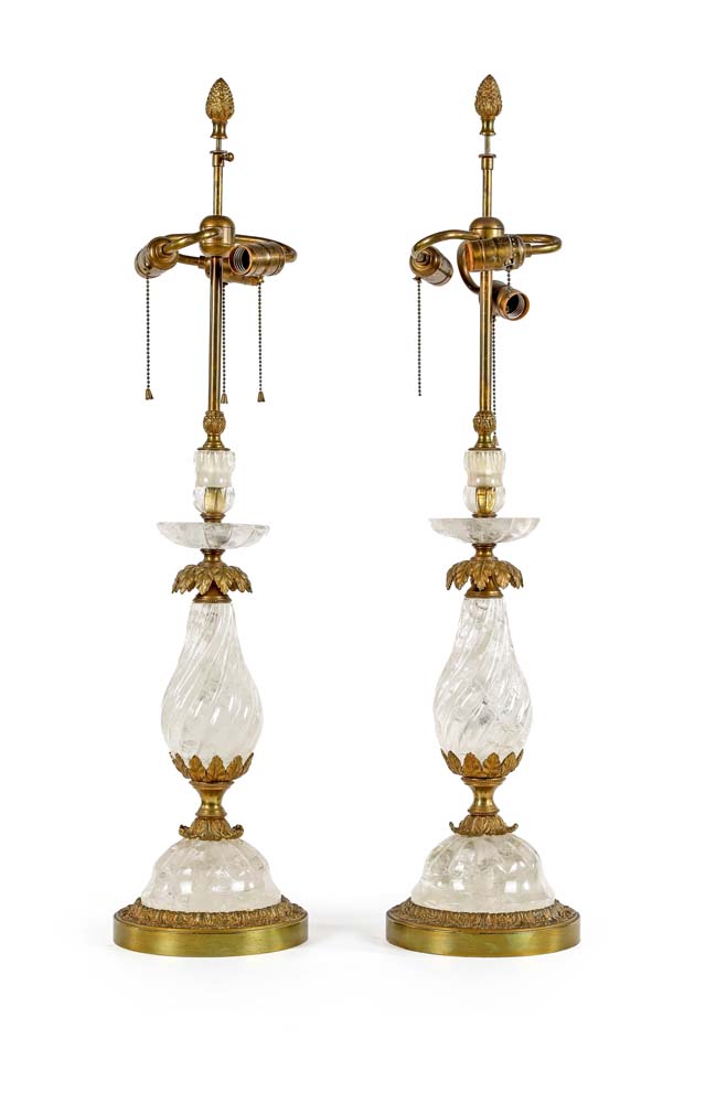 Coppia di lampade da tavolo in cristallo di rocca e bronzo dorato, XIX secolo struttura affusolata caratterizzata da nervature ad andamento elicoidale, con estremità calzate da cespi in bronzo cesellato e dorato su piede a cupolino e base in bronzo; stelo cilindrico sormontato da tre braccetti reggi lampada sagomati altezza cm 87