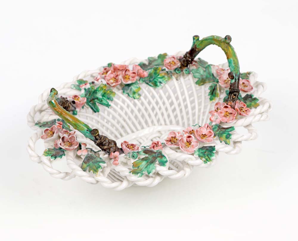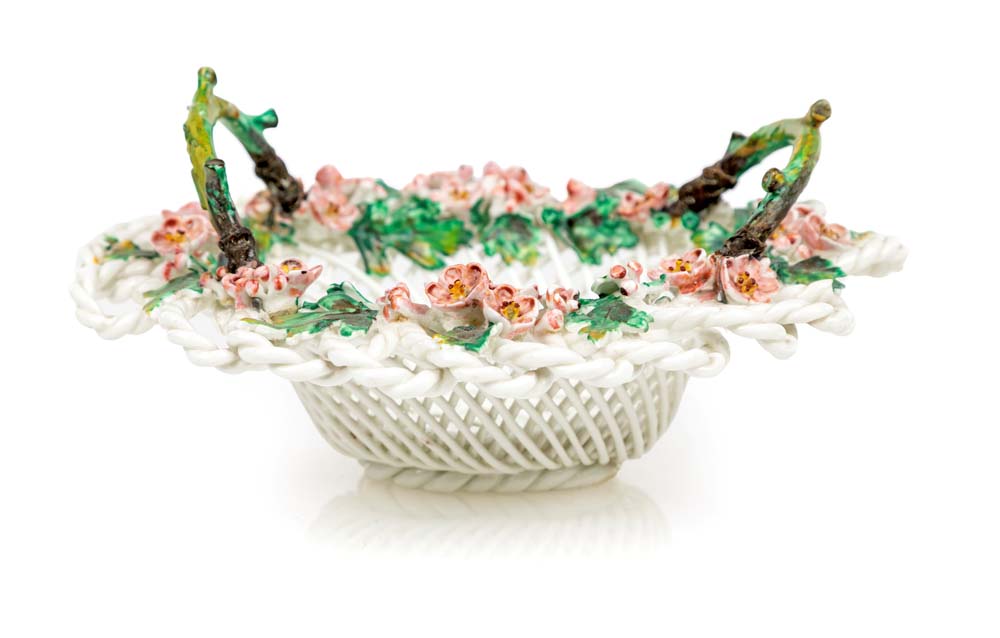 Cestino in ceramica bianca, Belleek, Irlanda, fine del XIX secolo interamente realizzato con fili a sezione circolare e piatta intrecciati fra loro; profilo impreziosito da corolle applicate in monocromia rosa; manici verdi cm 9x20x15,5