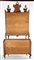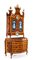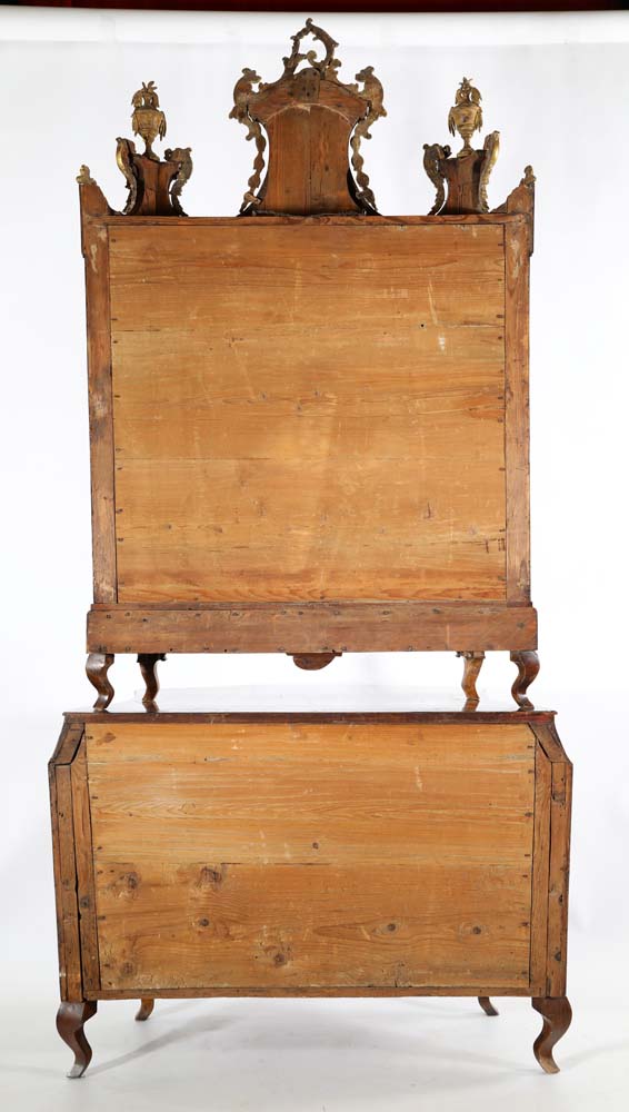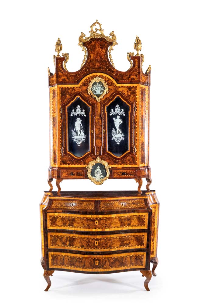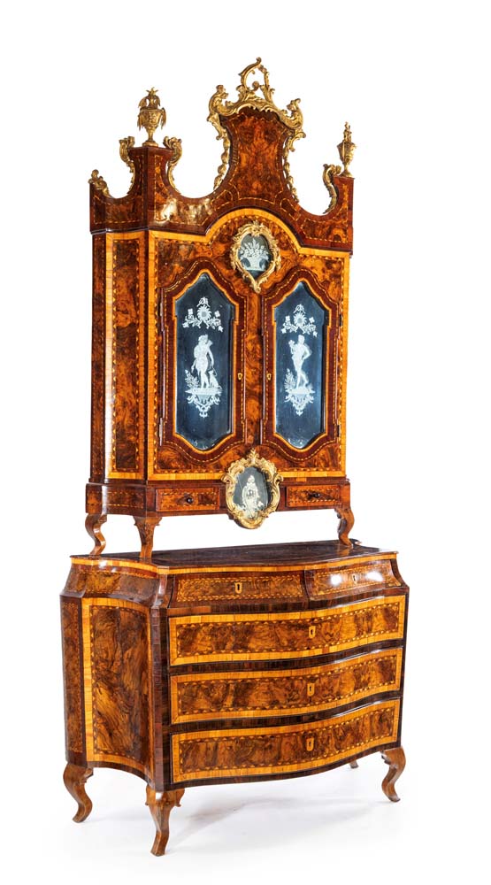 Mobile a doppio corpo in legni pregiati, Lombardia, XVIII secolo con specchiature in radica incorniciate da filettature in ciliegio sottolineate da bordure a motivi geometrici in essenze a contrasto; corpo superiore coronato da timpano spezzato rifinito da rilievi vegetali minuziosamente intagliati e dorati, con vasi scolpiti a tutto tondo e brevi cascatelle di boccioli che dalla sommità discendono lungo la curva degli elementi laterali. Facciata decorata da specchi sagomati con composizioni floreali e figure di Diana e di Apollo incise, racchiusi da cornici in legno intagliato e dorato, scandita da due ante  e due cassetti in linea sottostanti. Corpo inferiore di linea mossa, con fascia a cavetto suddivisa in due tiretti e tre cassetti in colonna di linea lievemente convessa; fianchi concavi delimitati da spigoli scantonati, piedi incurvati. Difetti e sostituzioni. cm 266x121x58