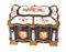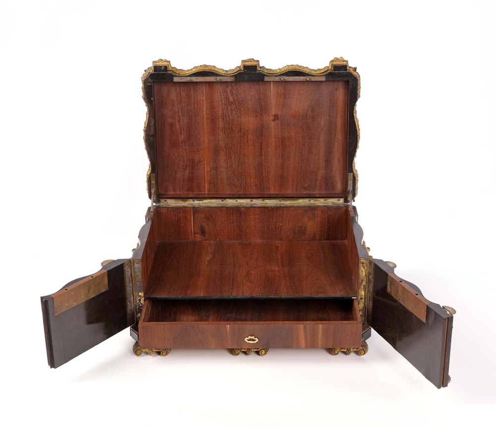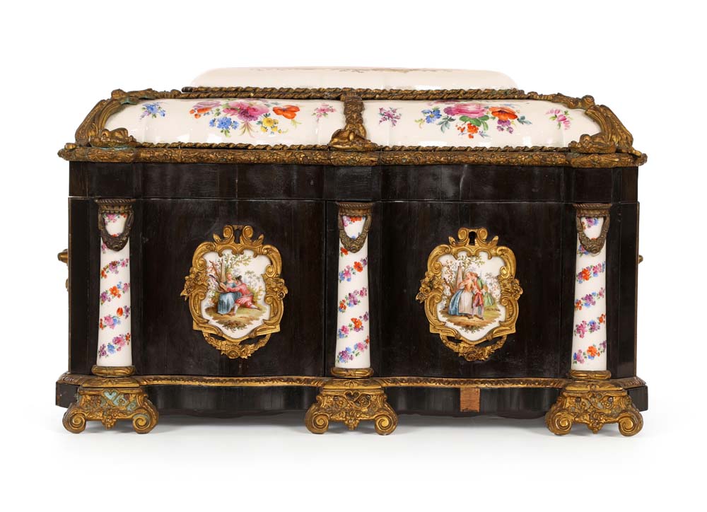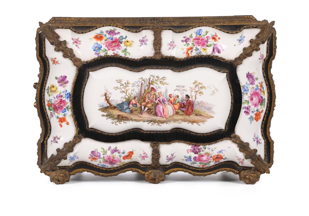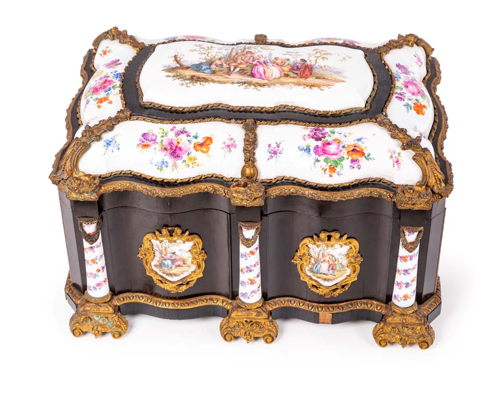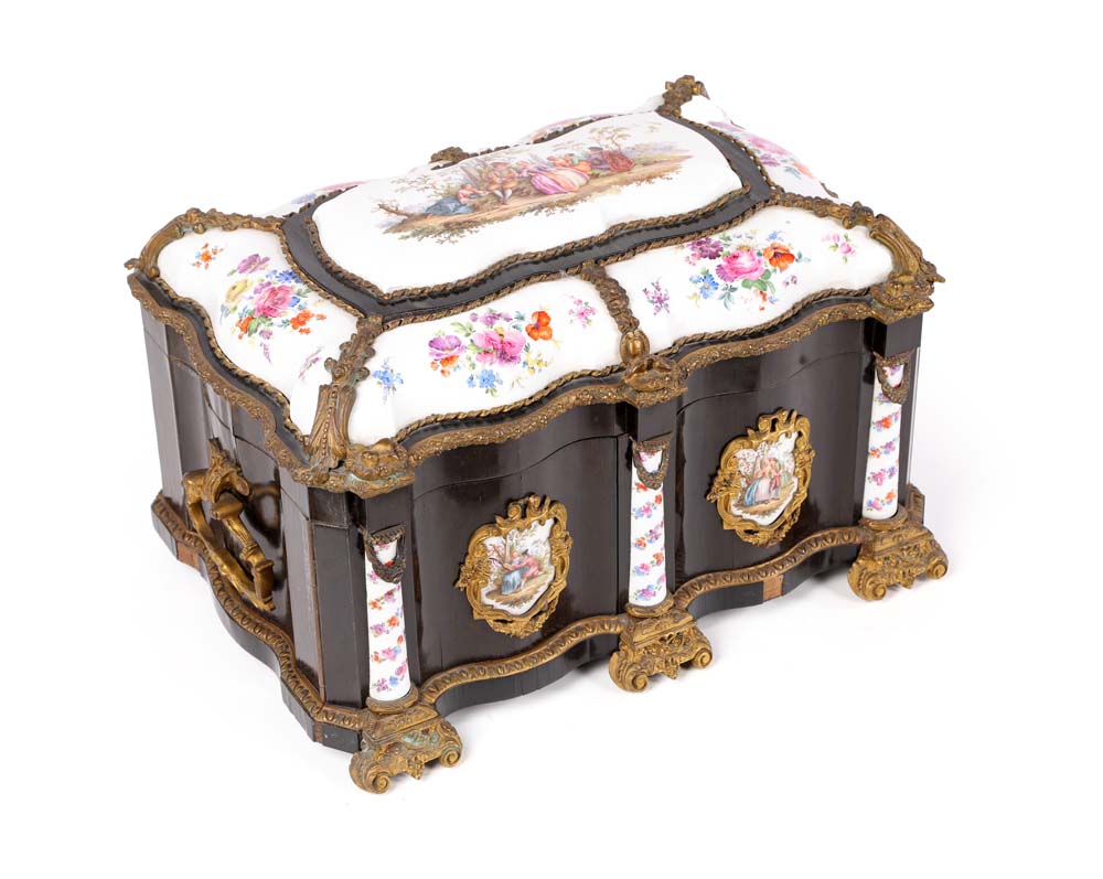 Cofanetto in legno ebanizzato con placche in porcellana policroma, Francia, XIX secolo di forma rettangolare sagomata, reca coperchio incernierato decorato da placche in porcellana bianca con decorazione dipinta in vivace policromia, racchiuse da cornici in bronzo dorato; al centro figure in abiti settecenteschi ambientate in un paesaggio alla maniera di Jean-Antoine Watteau; tutt'intorno composizioni di fiori. La facciata, di linea sagomata, è decorata da scudi in porcellana con scene galanti ed è suddivisa in due ante delimitate da lesene semicircolari che celano un cassetto. Maniglie laterali in bronzo dorato, piedi a mensola. Lievi difetti cm 25x40x28