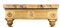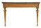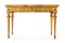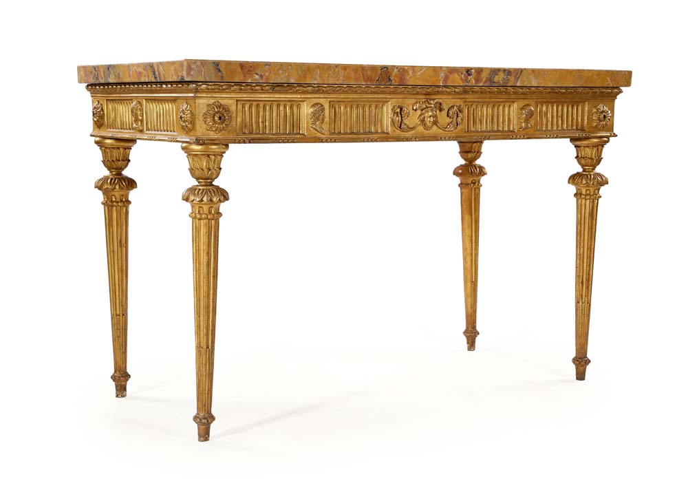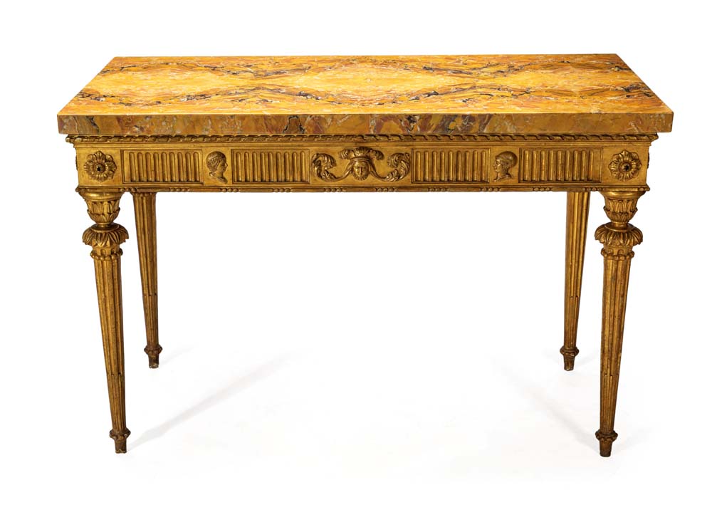Console Luigi XVI in legno dorato, fine del XVIII secolo piano lastronato in marmo giallo antico, fascia lineare delimitata da corolle angolari, percorsa da scanalature verticali interrotte da profili classici contrapposti e da un mascherone centrale affiancato da girali vegetali. Gambe rastremate scanalate con attacchi in forma di vaso ricoperto da due ordini foglie lanceolate in parte sovrapposte cm 102x155,5x77