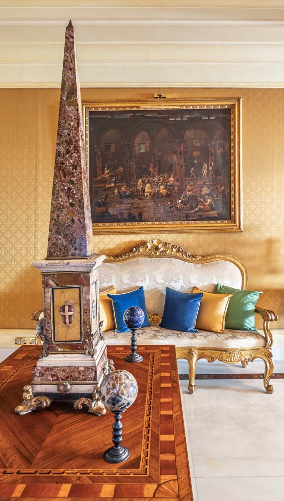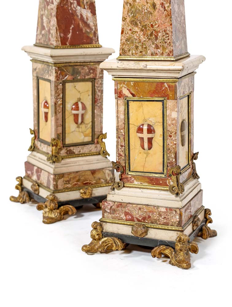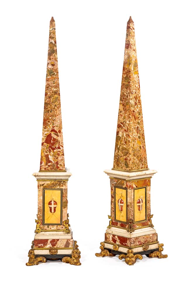 Coppia di grandi obelischi in marmi pregiati, manifattura romana su commissione sabauda, fine del XVII/inizi del XVIII secolo Gli slanciati fusti piramidali a sezione quadrangolare realizzati in breccia africana, poggiano su basi architettoniche a più ordini, scandite da pannelli riquadrati che ospitano lo stemma sabaudo con croce bianca su scudo convesso in marmo rosso antico inserito su specchiature in marmo giallo antico. Le basi sono ulteriormente arricchite da applicazioni in bronzo dorato finemente cesellato, con volute e fogliami.