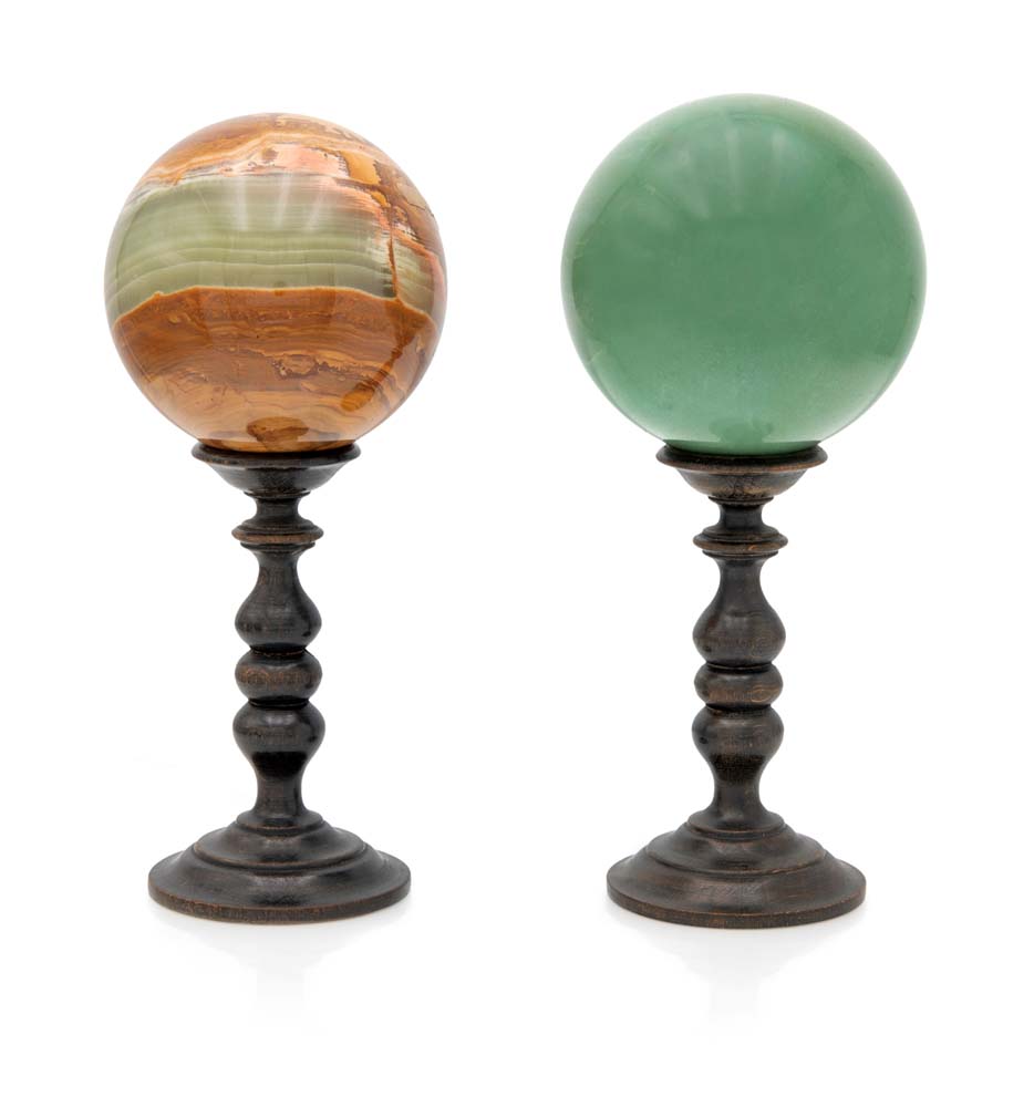 Lotto 58 | Due sfere in marmi diversi con piedistalli in legno tornito una di onice ed...