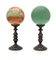 Due sfere in marmi diversi con piedistalli in legno tornito una di onice ed una di avventurina