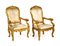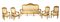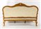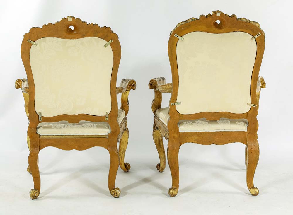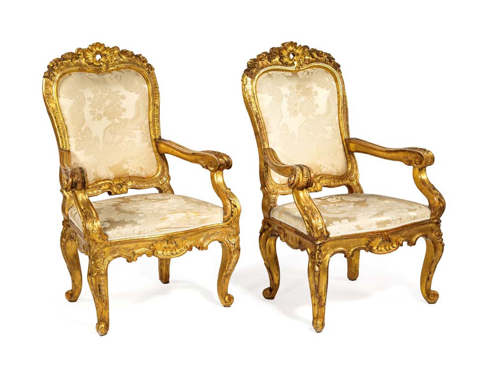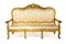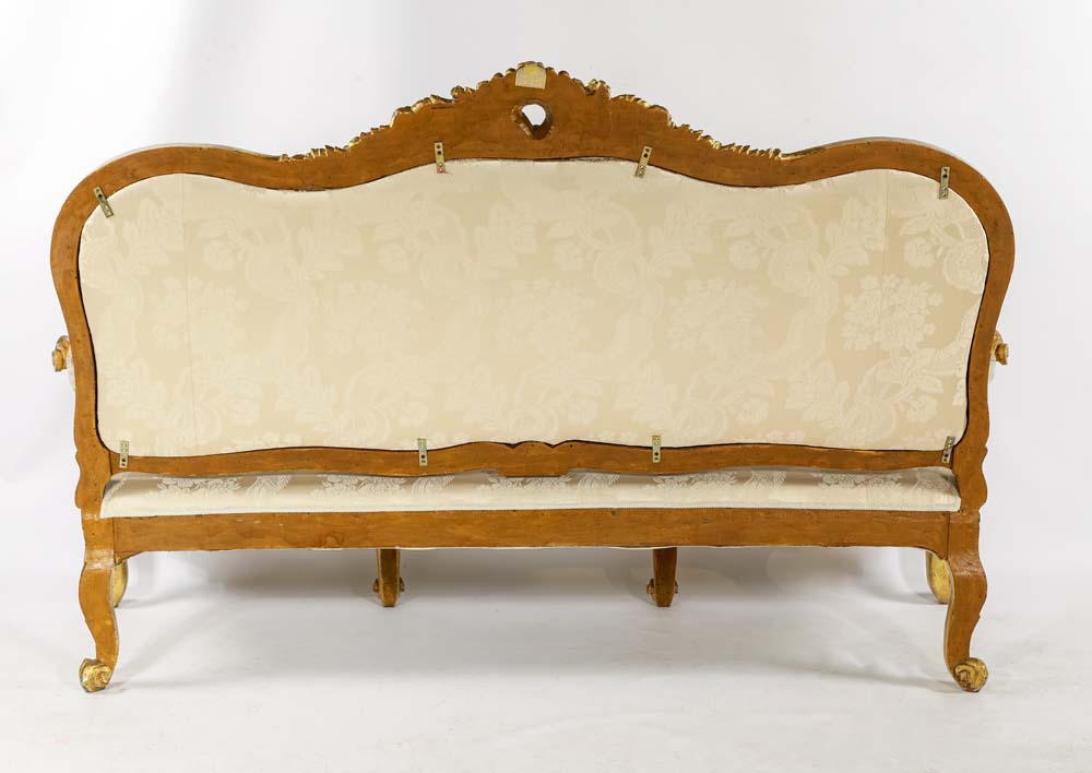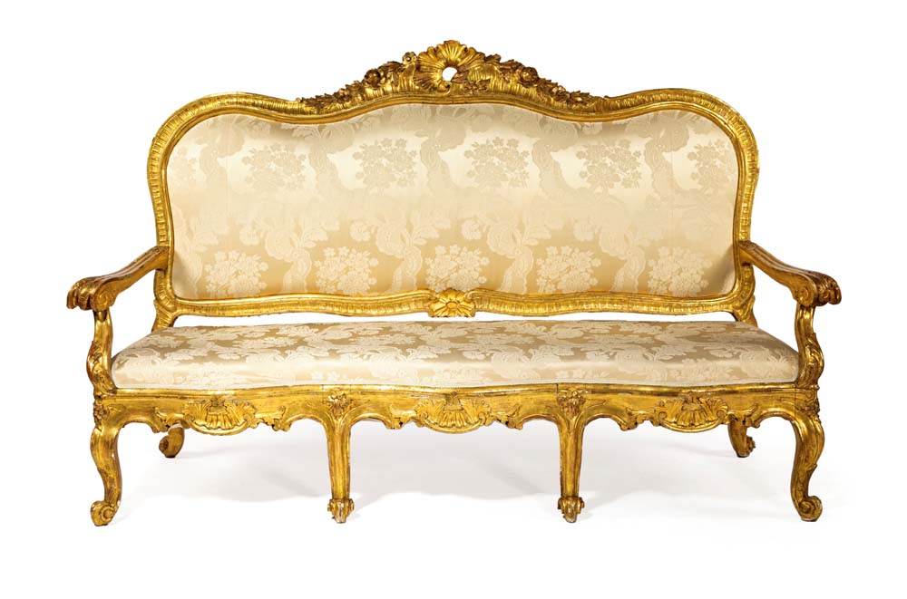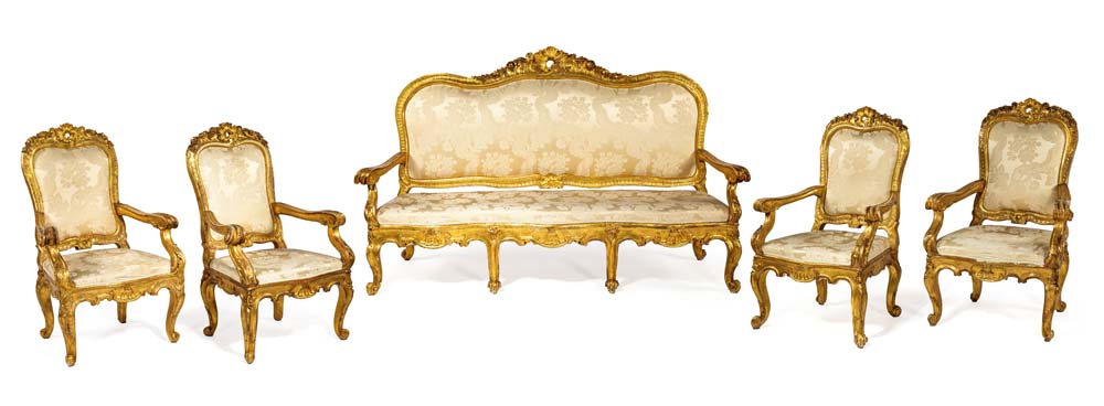 Divano e quattro poltrone in legno intagliato e dorato, Roma, XVIII secolo cornici sagomate centrate da un cartiglio asimmetrico affiancato da brevi tralci che impreziosiscono il profilo superiore dello schienale; quest'ultimo, così come il sedile, è imbottito e rivestito in damasco di seta avorio; braccioli sagomati terminanti a ricciolo, gambe mosse cm 125x210x60 e cm 118x82x55 rispettivamente