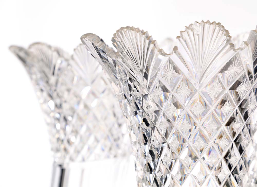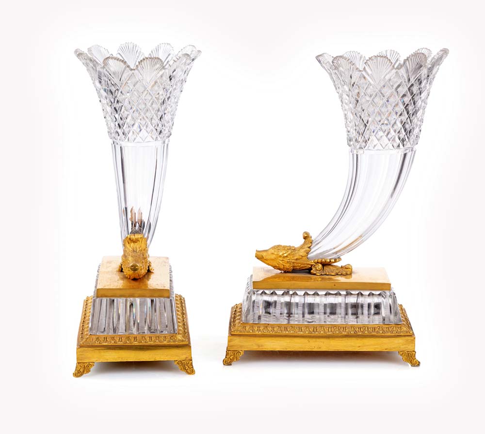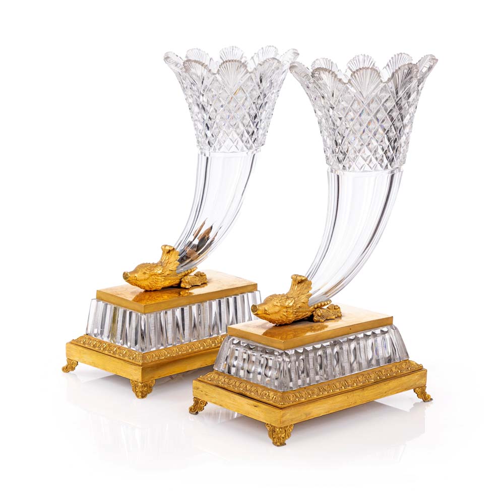 Coppia di cornucopie in cristallo e bronzo dorato, Francia, XIX secolo emergenti da una testa di cinghiale finemente cesellata, recano parte superiore con tagli geometrici e sfaccettati, imboccatura svasata e orlo a palmette; basi architettoniche in cristallo e bronzo dorato, con piedi angolari e cornici modanate cm 42x26x15,5